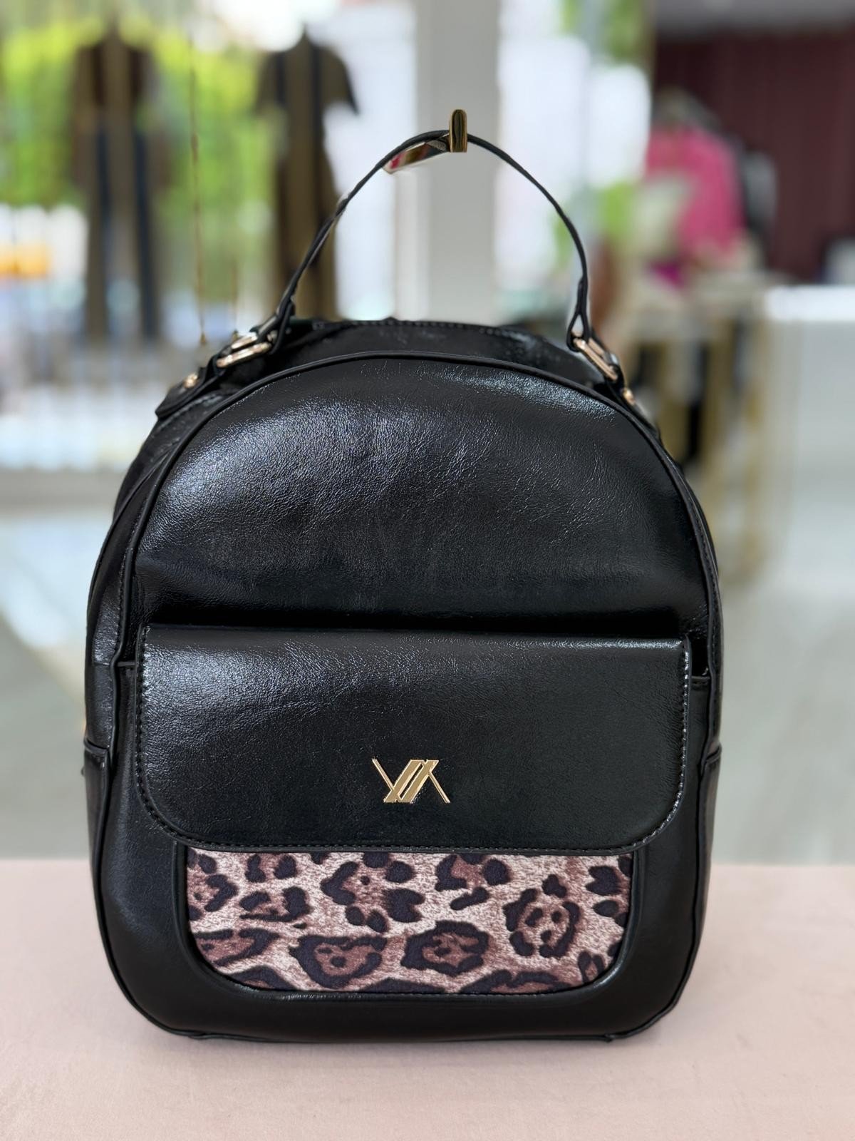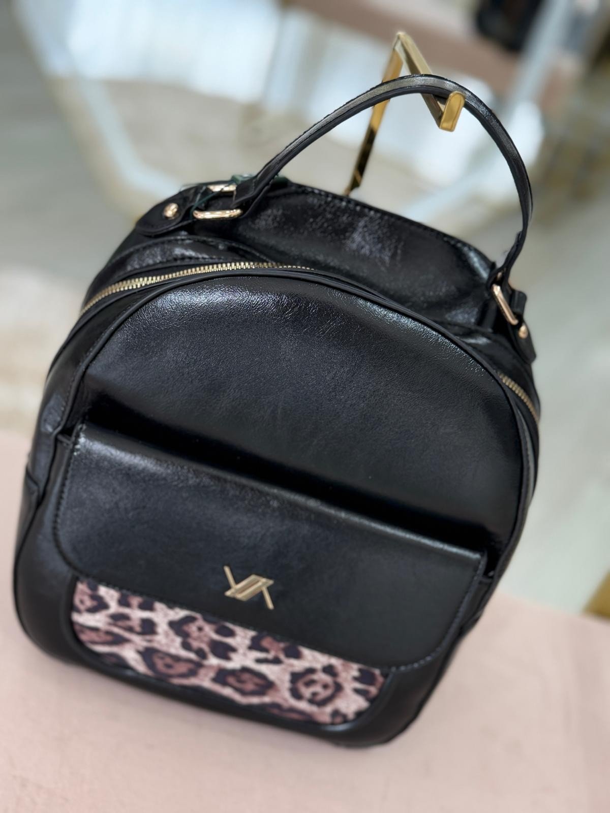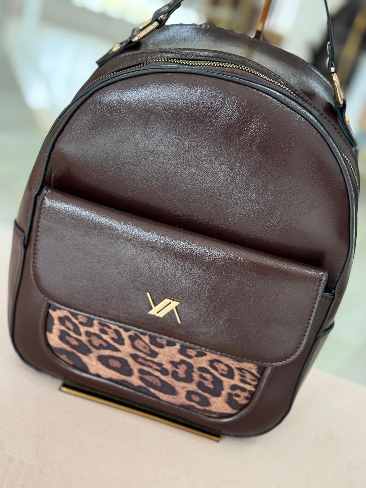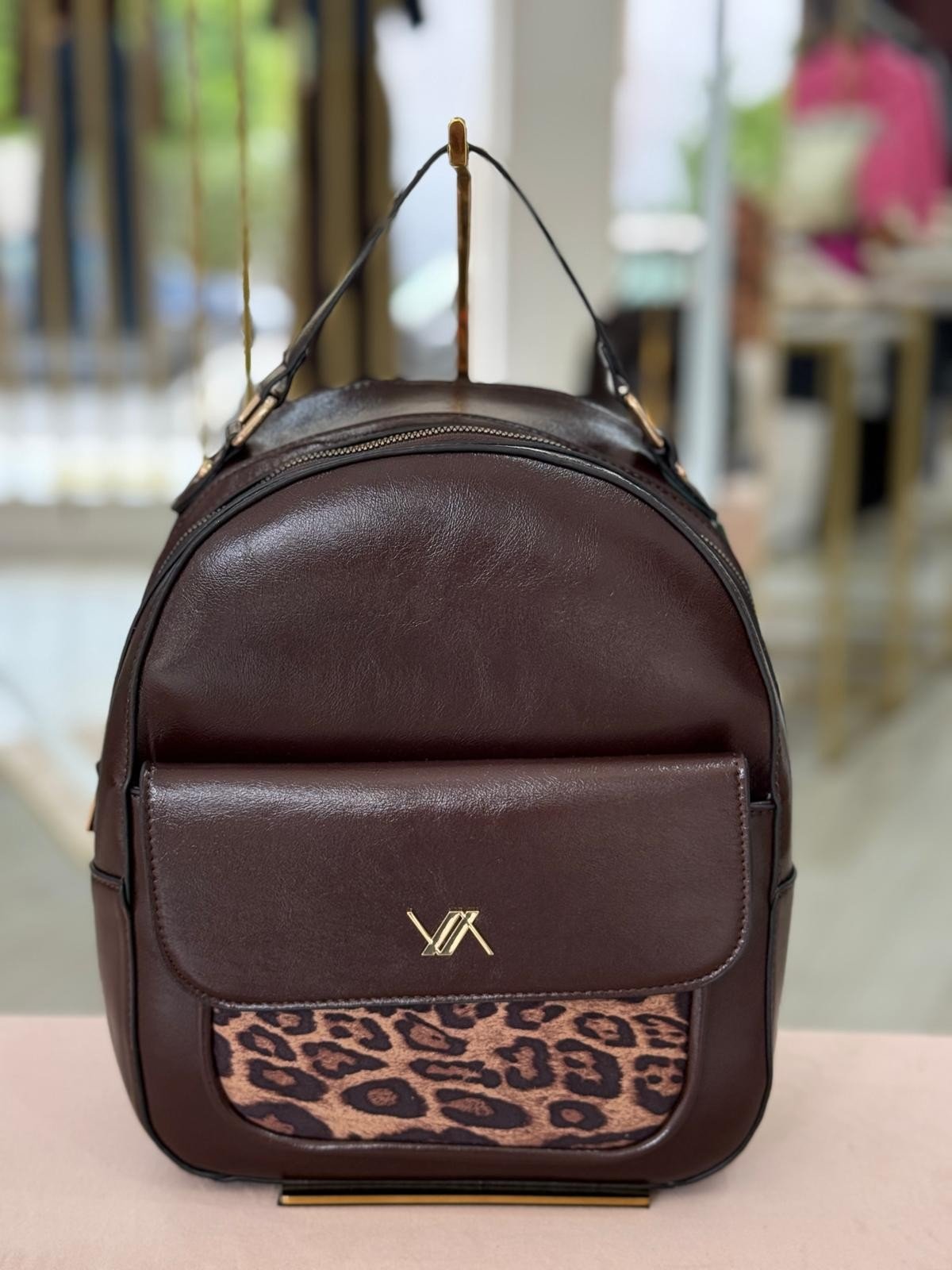 Mochila de alças, com bolsa na frente animal print. Fechamento com fecho de correr.