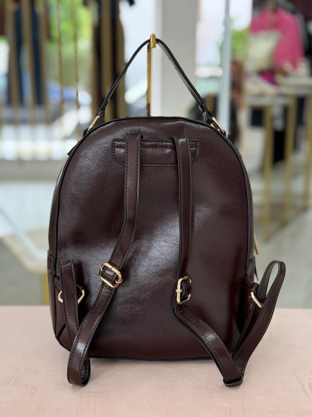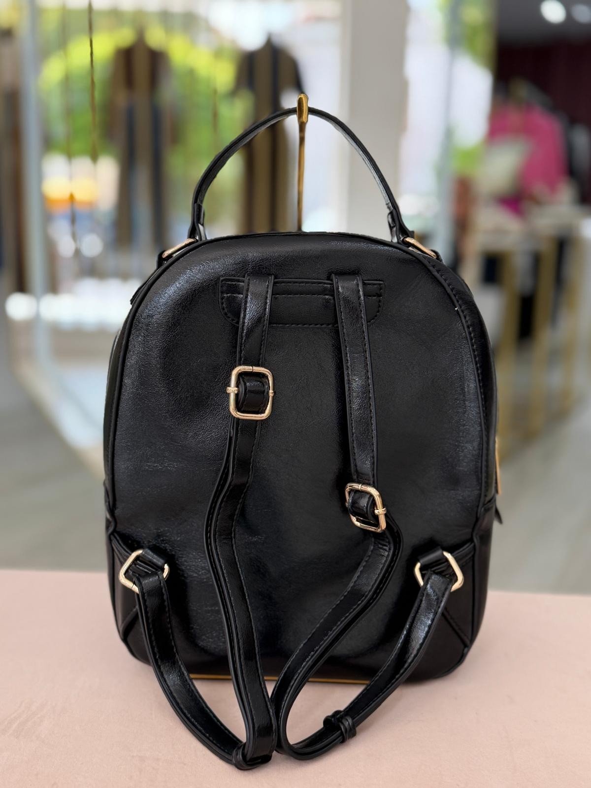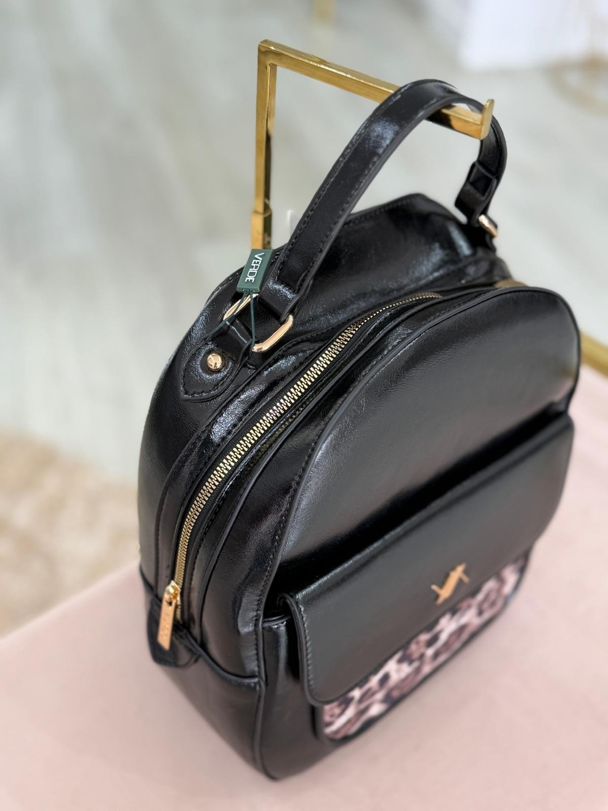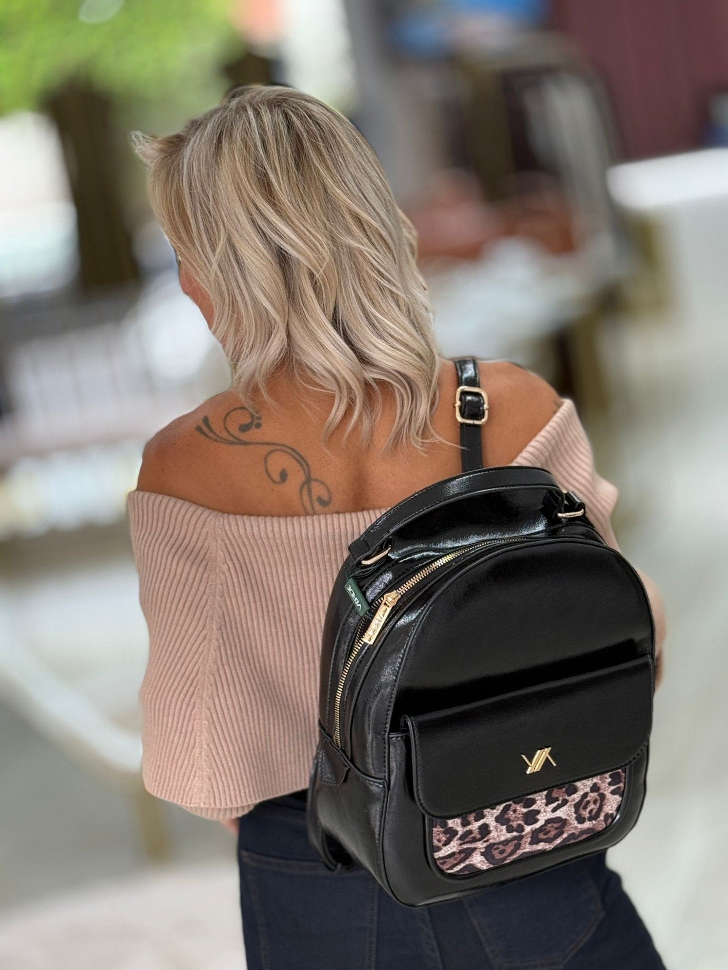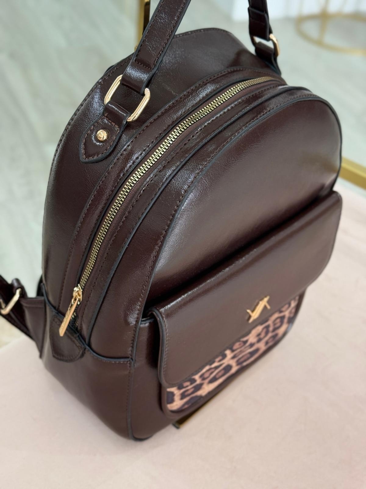 Mochila de alças, com bolsa na frente animal print. Fechamento com fecho de correr.