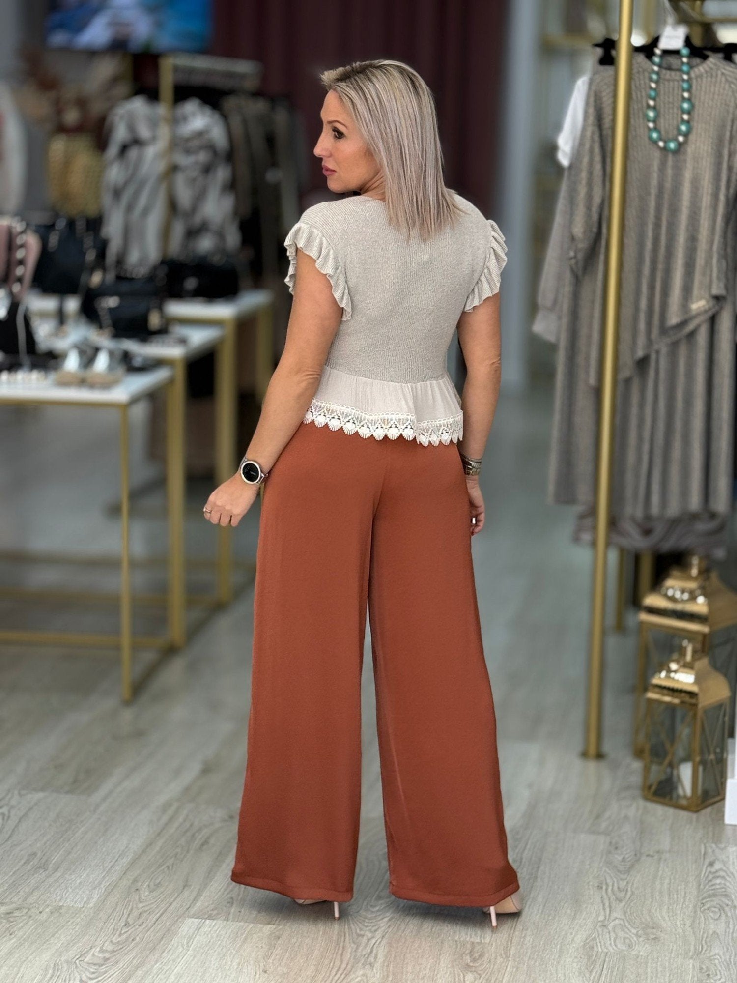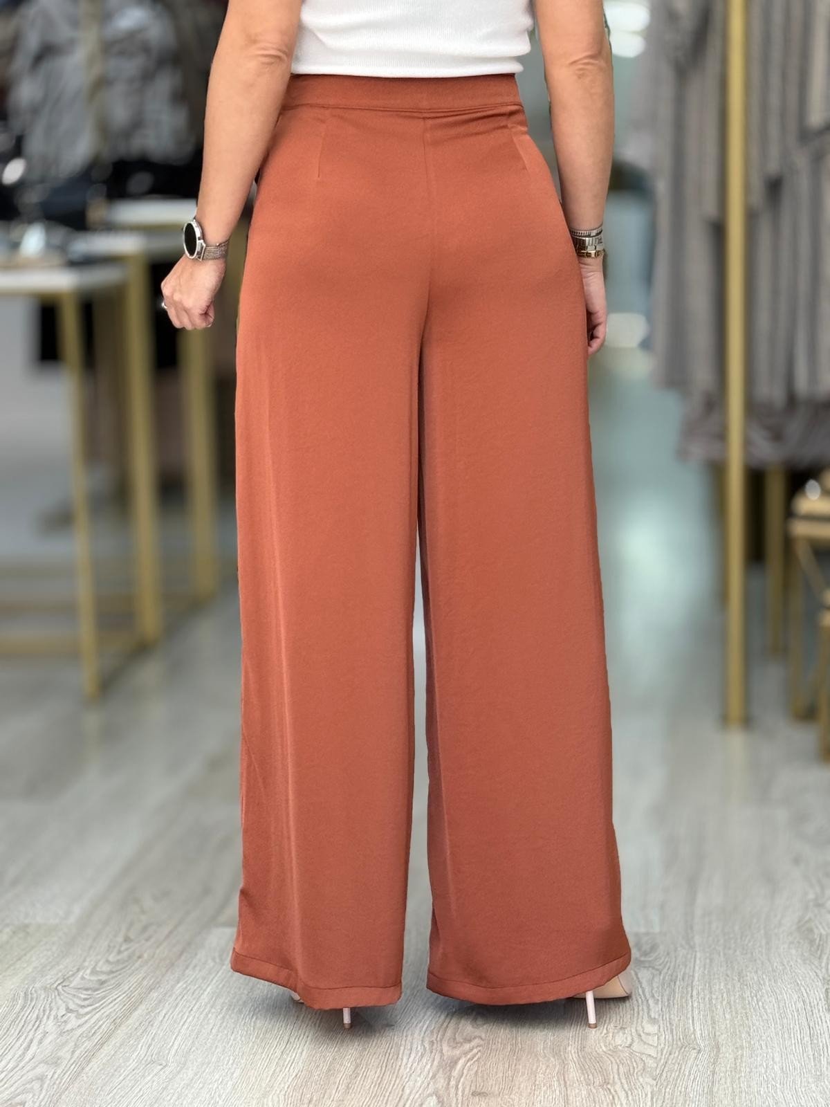 Pantalona fluida em tecido acetinado. Fechamento com fecho lateral oculto.