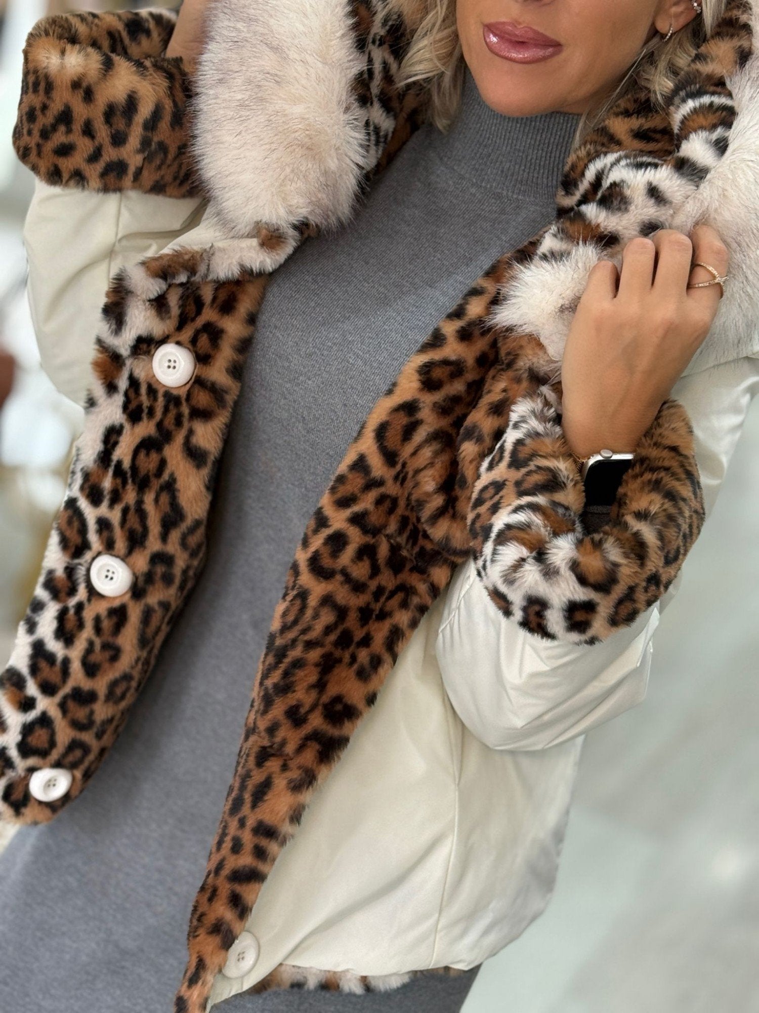 A parka em tom pérola I26PRK117LUX10 combina delicadeza e sofisticação num modelo reversível que reflete elegância em todas as versões. O exterior claro, de inspiração luminosa e feminina, contrasta com o interior em padrão animal, revelando um lado mais audacioso e moderno. A gola em pêlo acrescenta volume e conforto, conferindo um toque de requinte ideal para os dias frios. Perfeita para coordenar com peças em tons neutros ou pastel, ou para suavizar looks mais marcantes, esta parka adapta-se com facilidade a diferentes momentos, desde um passeio elegante até a um encontro mais casual. Uma escolha versátil que une suavidade, estilo e conforto num só gesto.