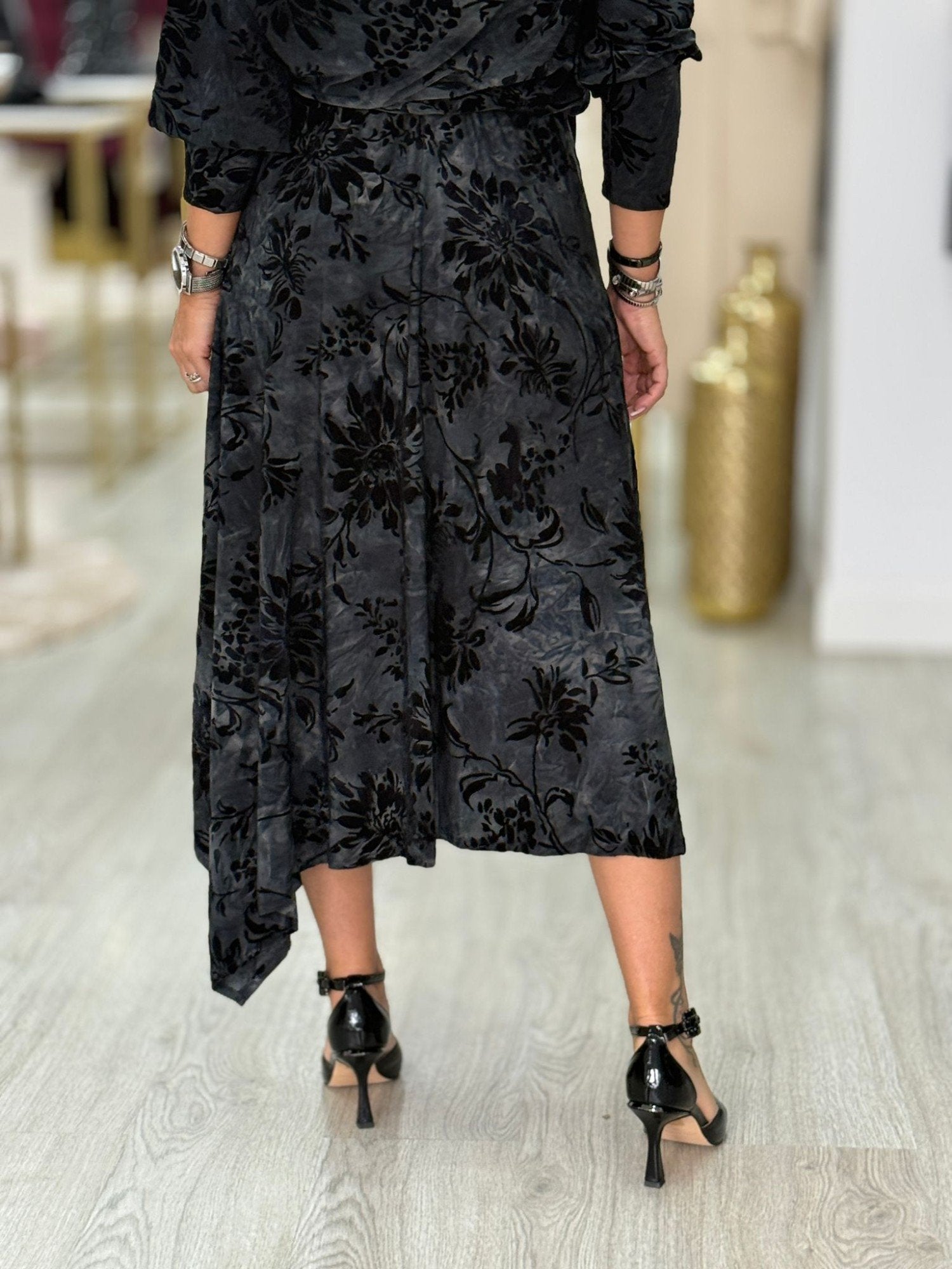 Saia midi em veludo com corte assimétrico e cintura elástica, realçada por uma fivela decorativa que acrescenta um toque sofisticado. O design combina textura e estrutura, criando uma silhueta elegante com movimento subtil.
