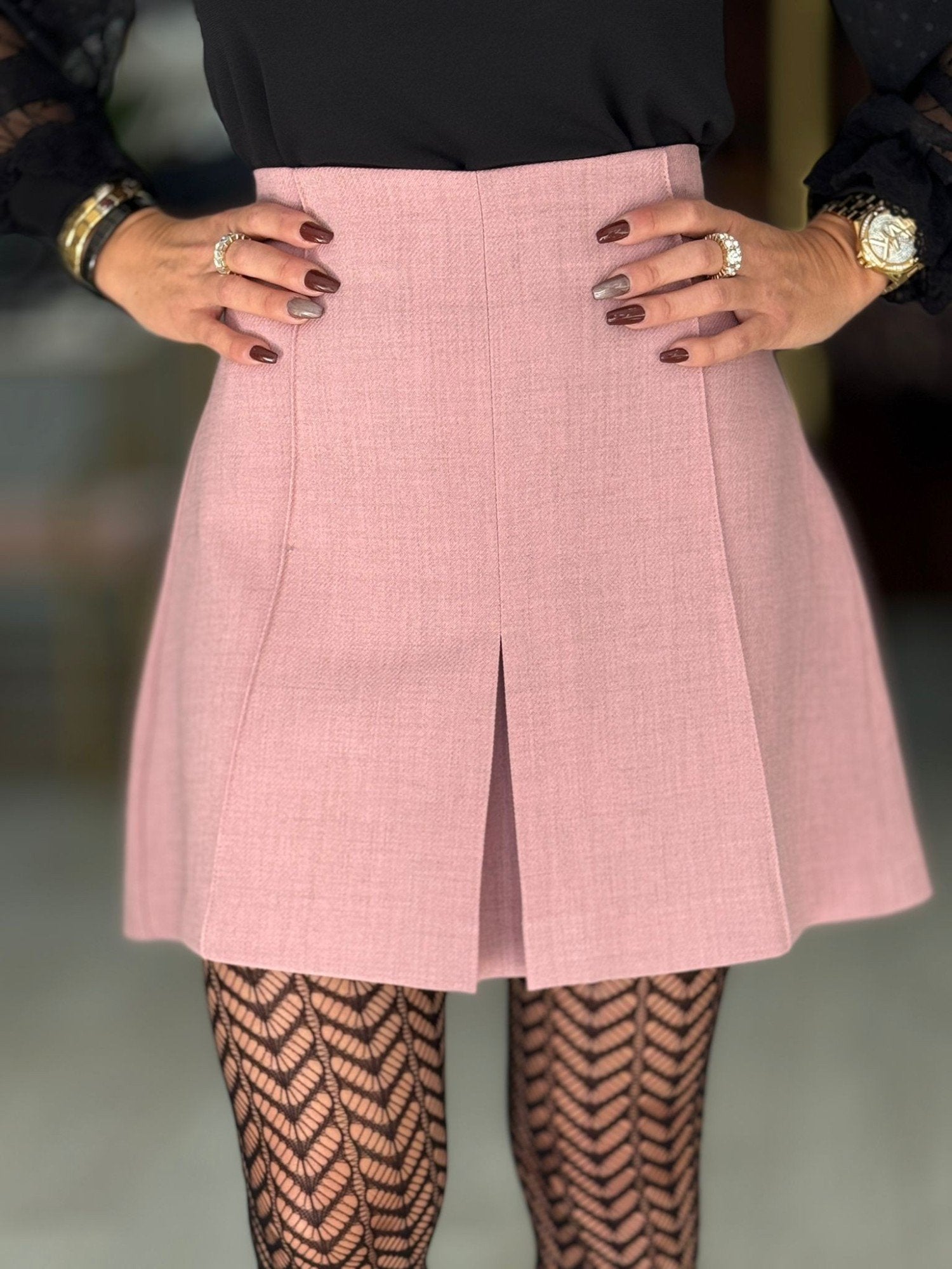 Saia- calção curta em tecido de alfaiataria com estrutura leve. Cintura média, abertura frontal e corte ligeiramente em A. O desenho limpo reforça a precisão da construção.