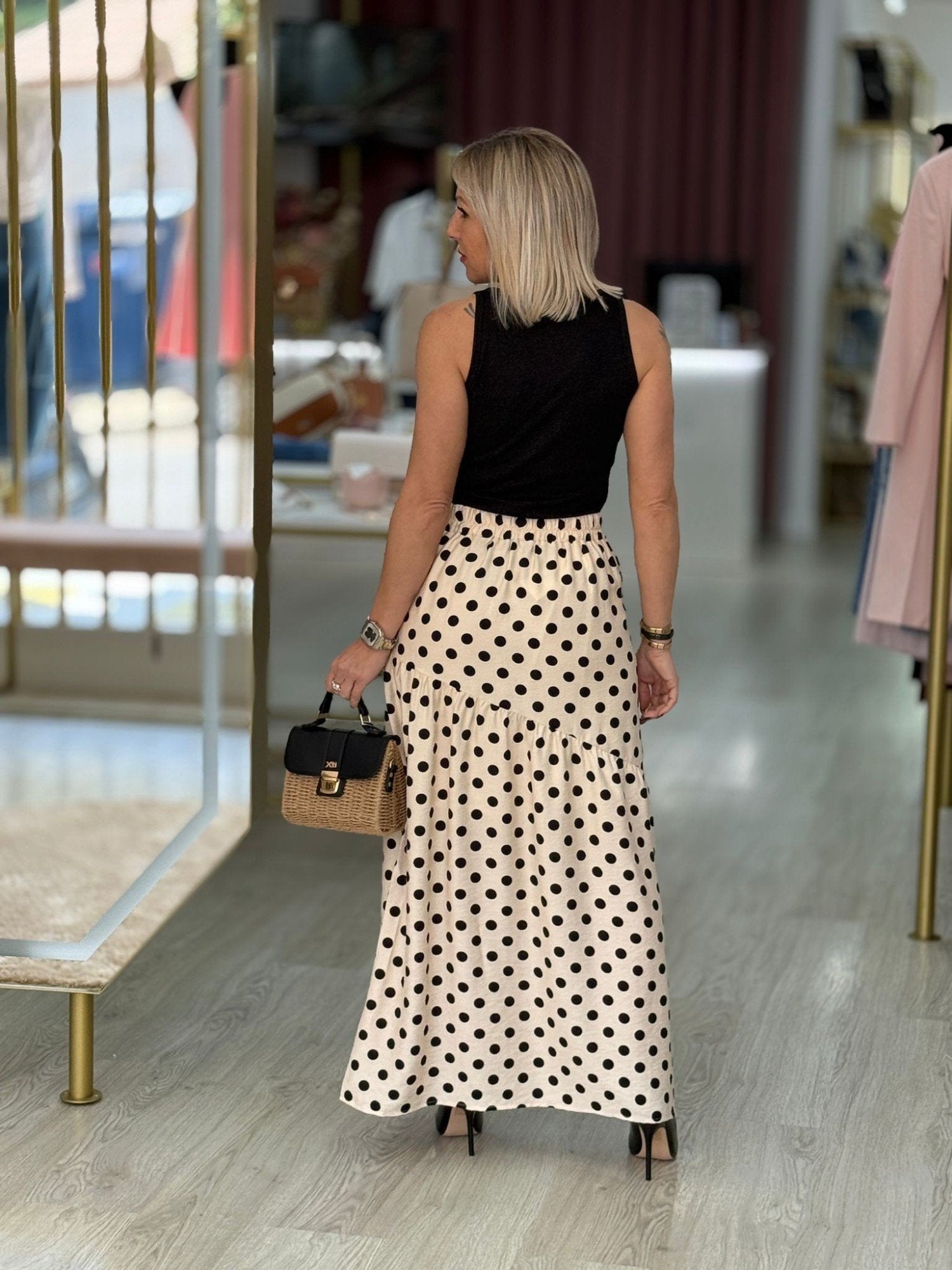 Esta saia longa e fluida cativa com o seu estampado às bolinhas, acrescentando um toque feminino e moderno. O seu corte justo realça delicadamente as curvas, enquanto a sua fluidez garante um ajuste moderno e leve. O comprimento da peça cria uma silhueta visualmente alongada para um look cheio de elegância. Forrada. Elástico na cintura atrás.