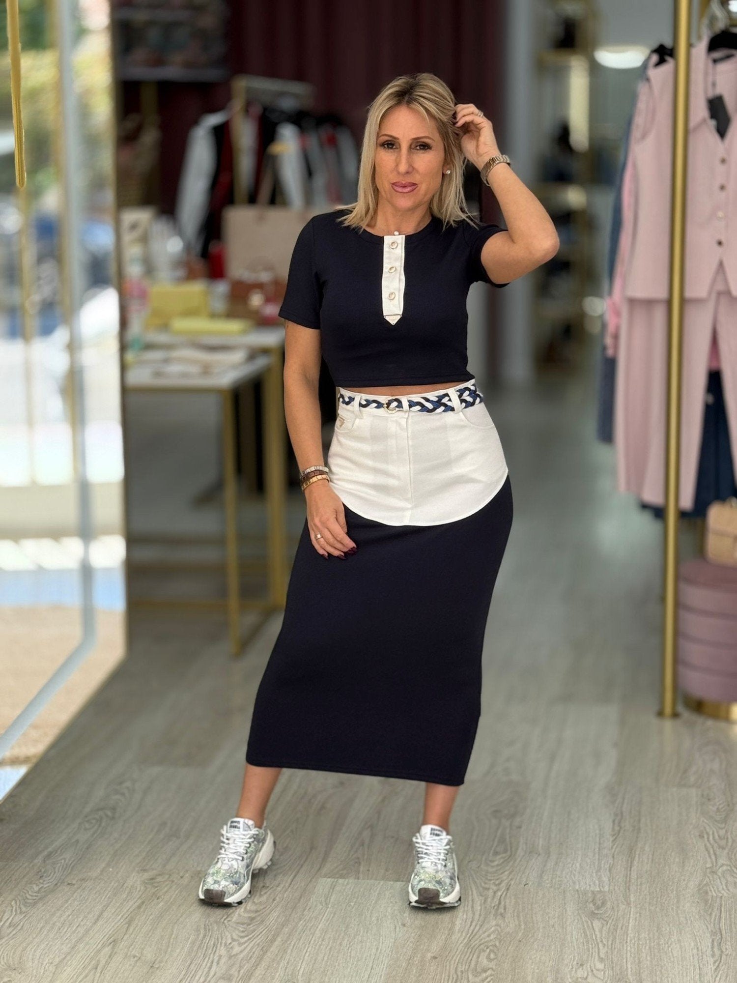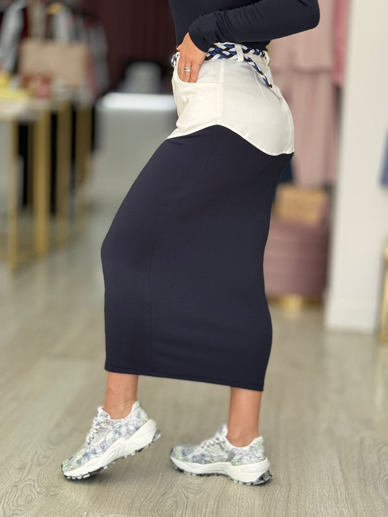 Saia comprida de silhueta reta com cintura subida e presilhas. Design de corte combinado, com contraste de tecidos para definir a linha da peça e criar um acabamento distintivo.