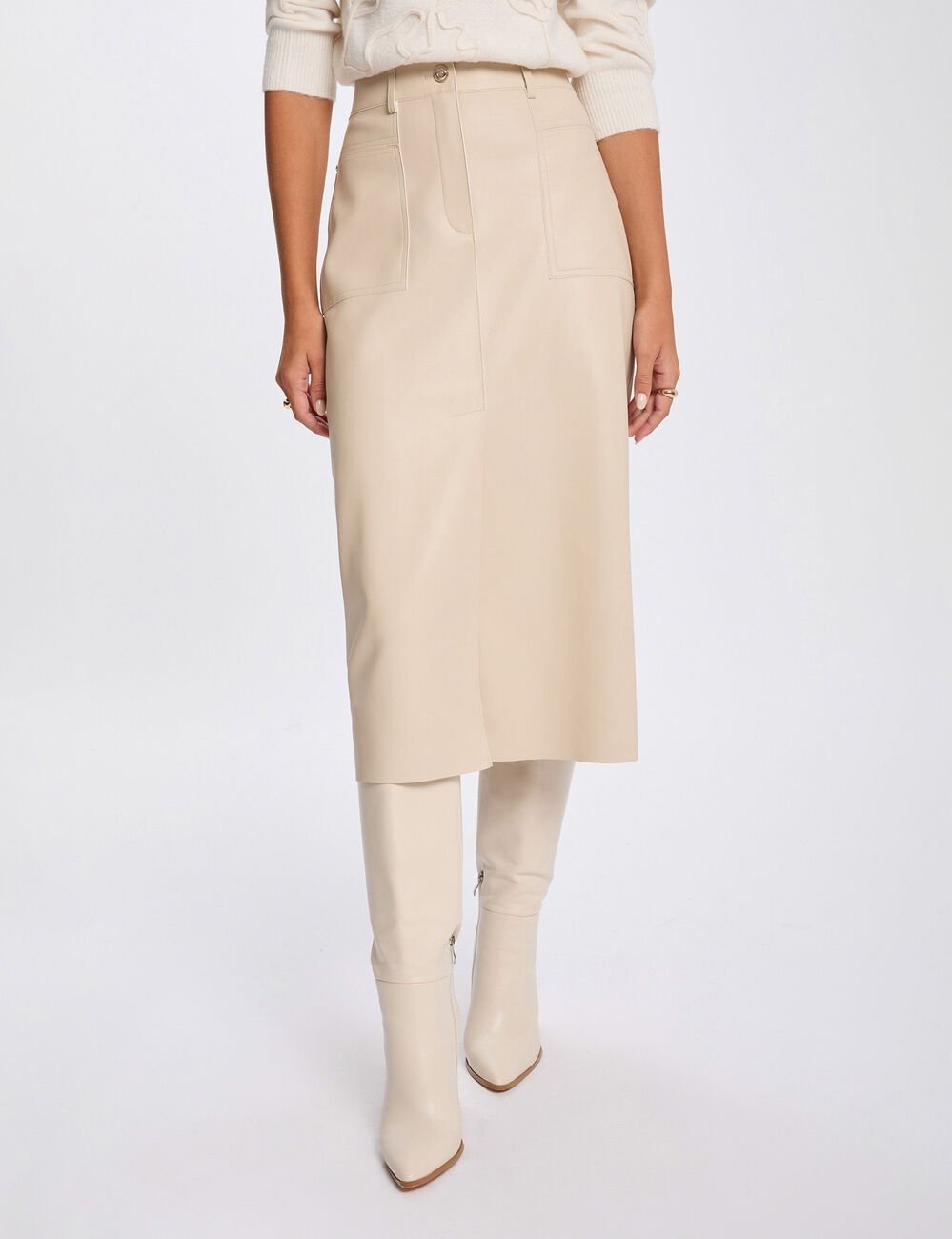 Esta saia longa e ajustada personifica a elegância sofisticada. A cintura alta alonga a silhueta com delicadeza, enquanto o corte realça as curvas, conferindo um efeito feminino e confiante. O couro sintético adiciona um toque moderno e arrojado a esta peça essencial do guarda-roupa contemporâneo. Fecha na frente com botão e fecho de correr oculto pelo tecido.