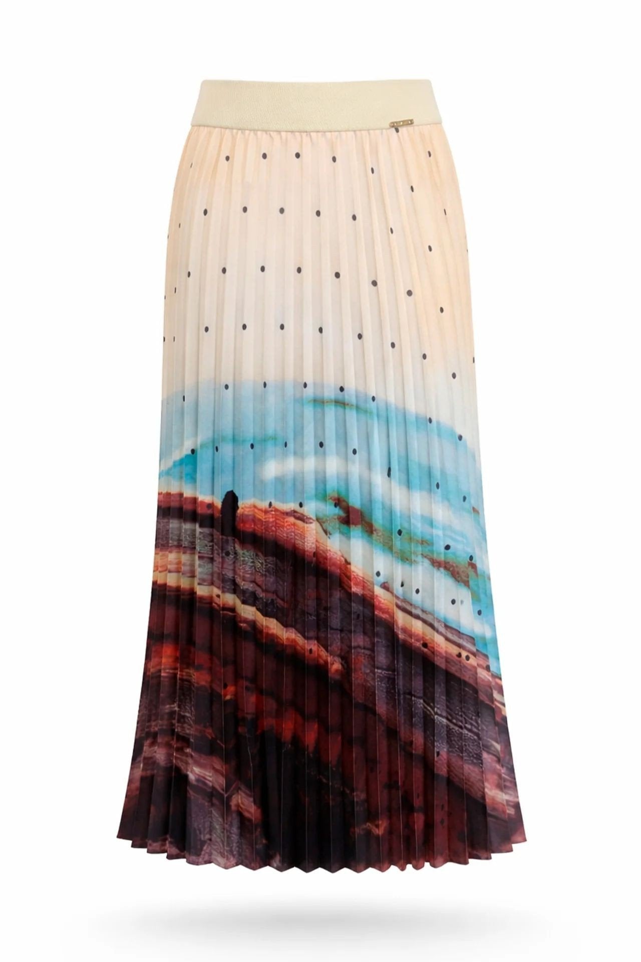 Saia comprida plissada com cintura elástica e padrão posicionado.