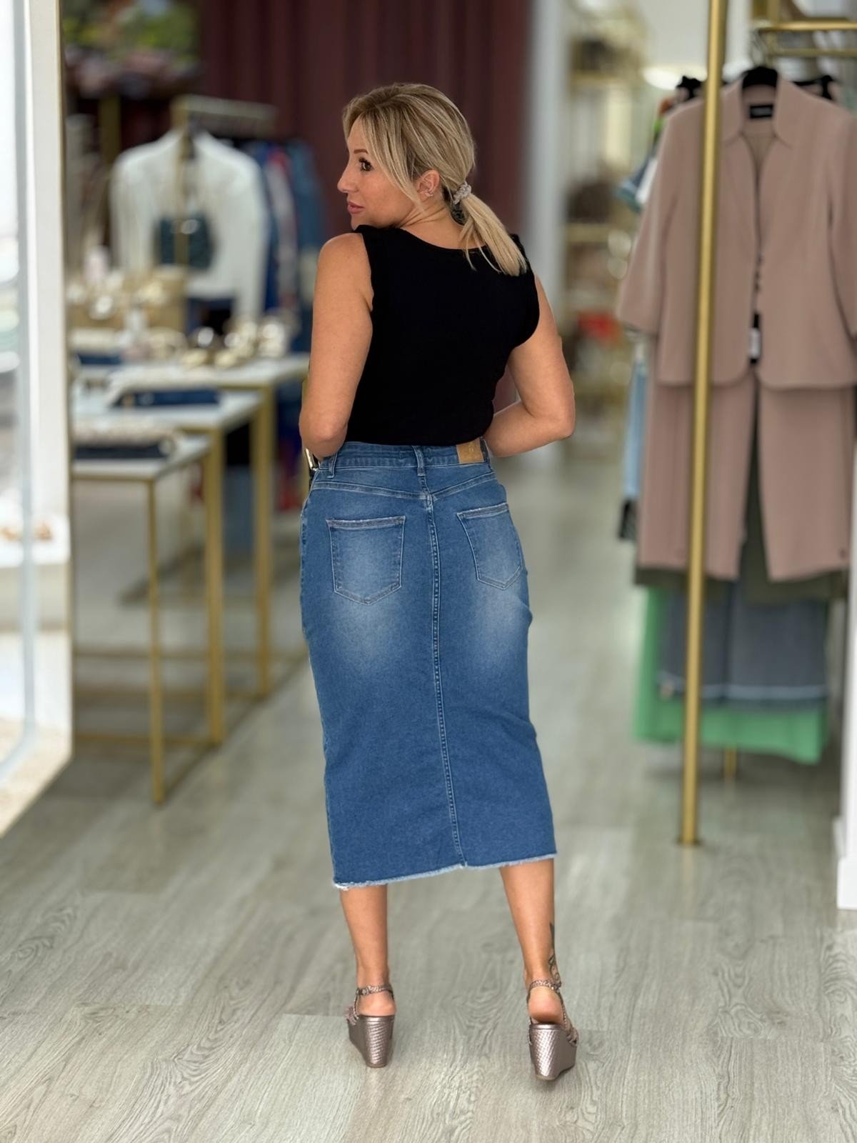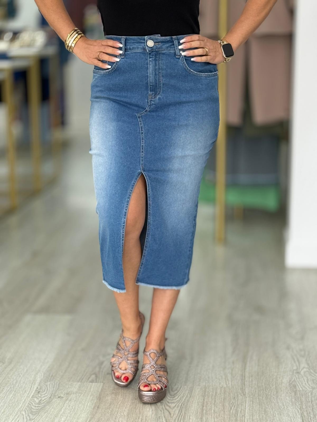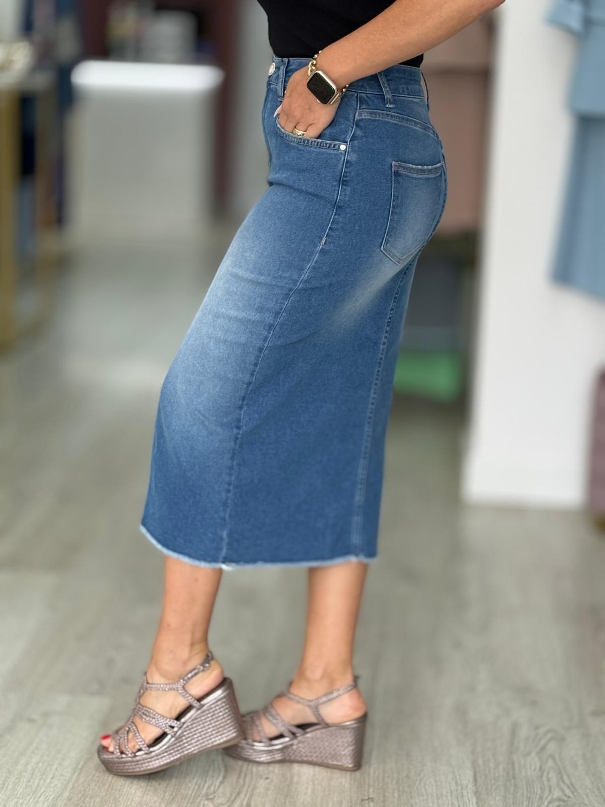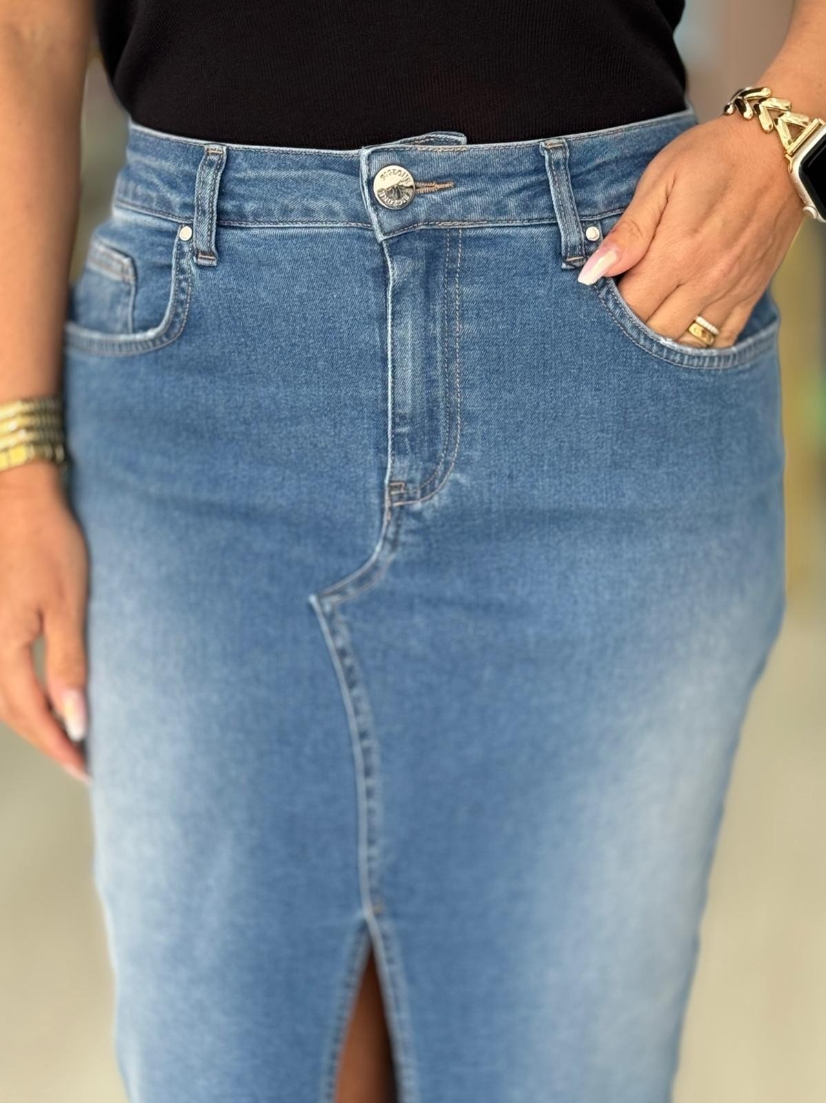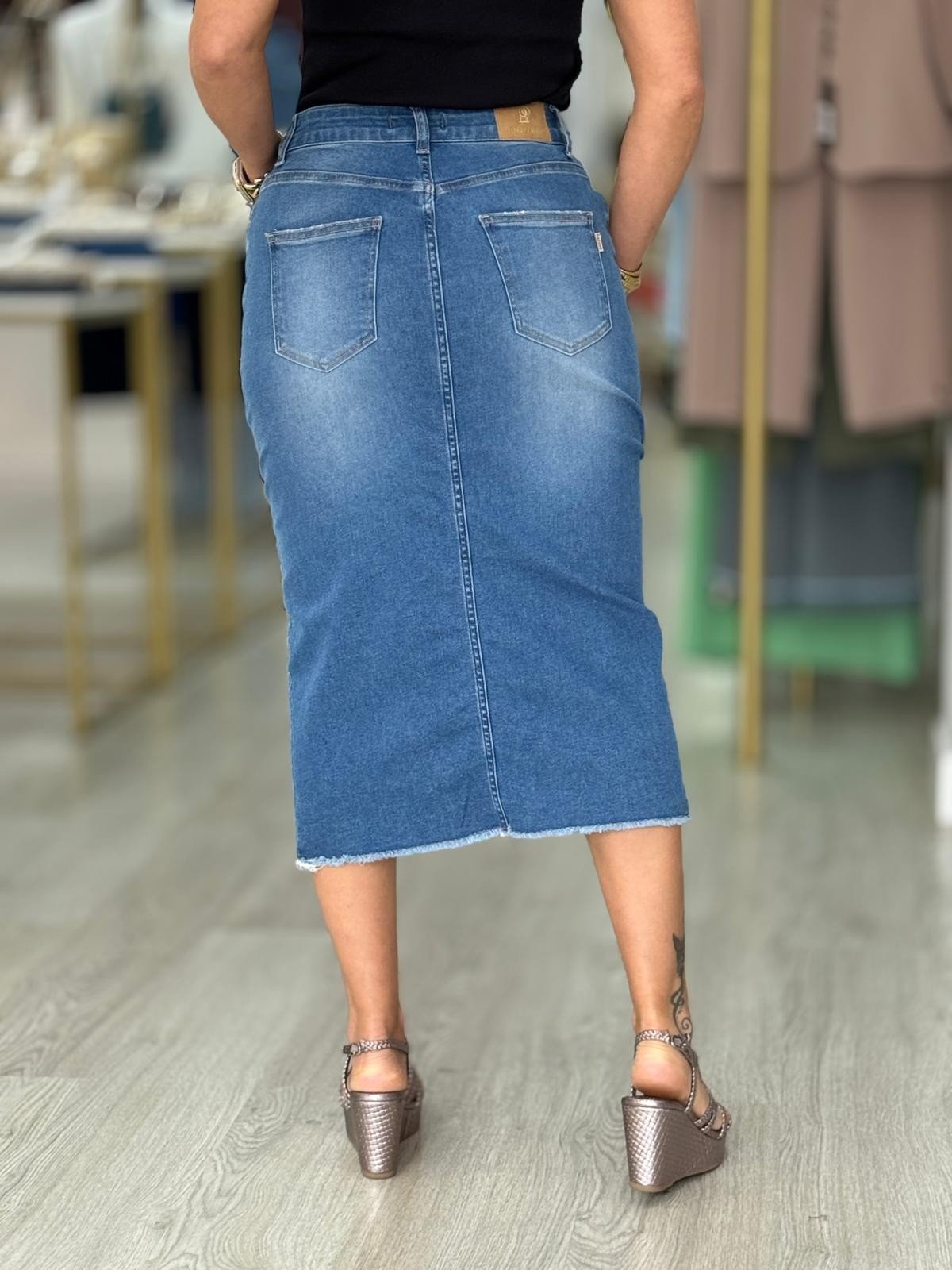 Saia de ganga midi de cintura subida com presilhas. Fechamento na frente com fecho de correr metálico e botão. Três bolsos à frente e e dois bolsos de chapa atrás. Abertura na frente. Bainha desfiada.