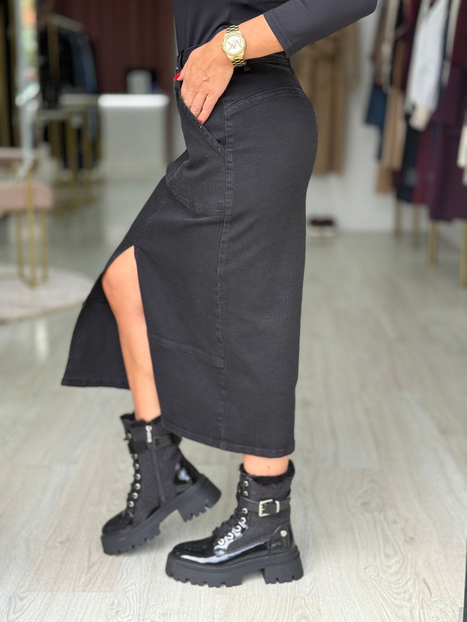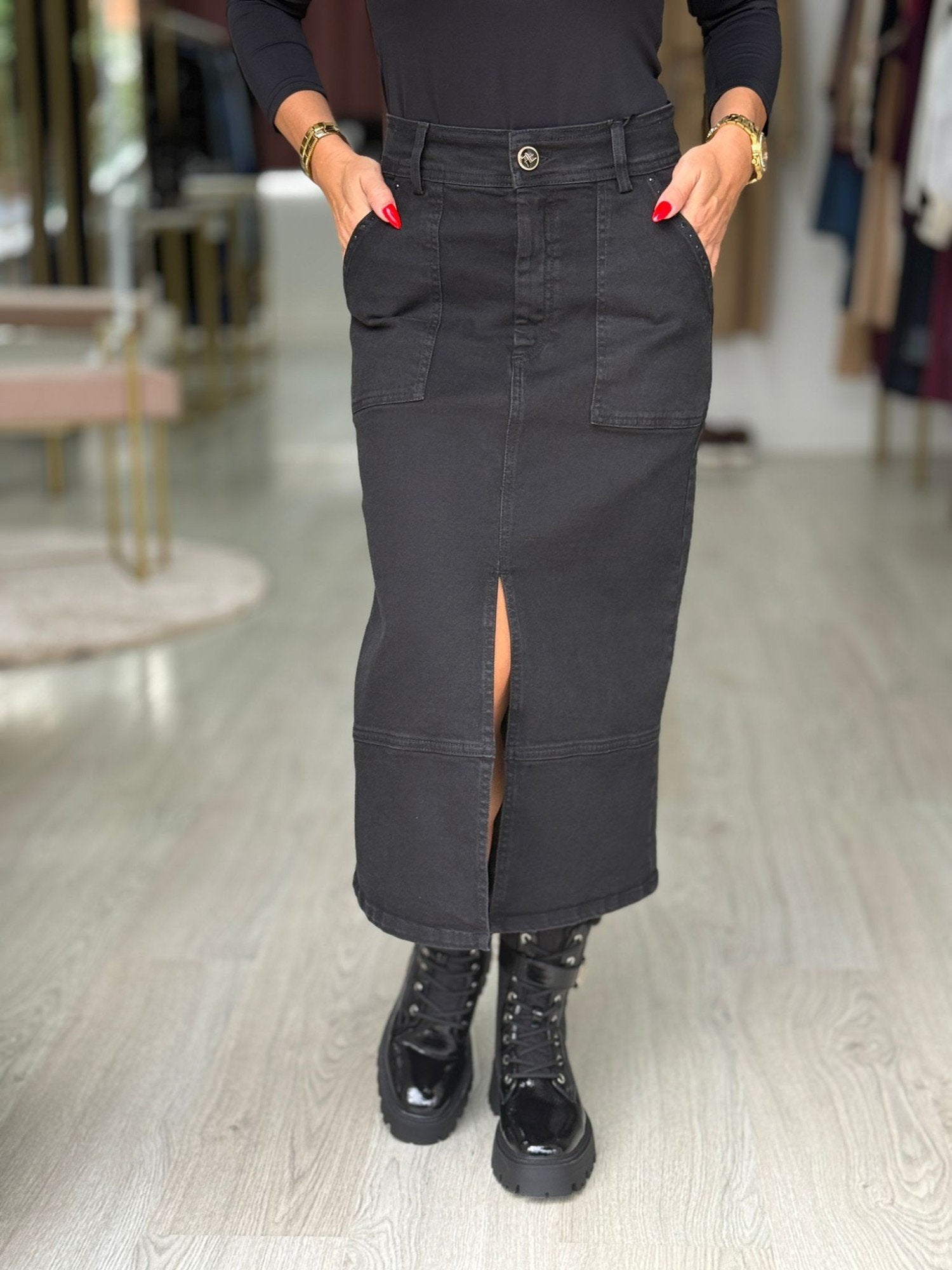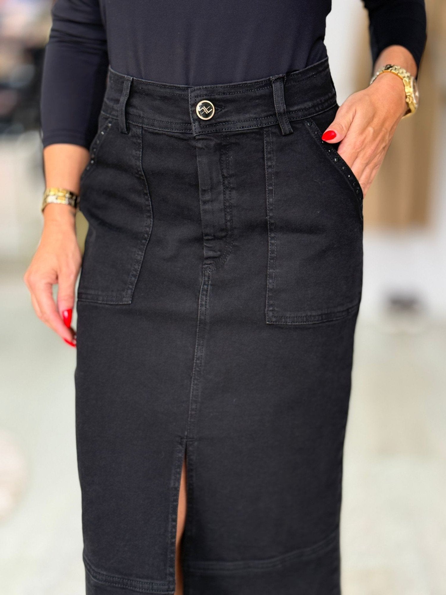 Saia em ganga preta de cintura subida com presilhas. Bolsos laterais com aplicação de strass preto. Abertura frontal. Fecha na frente com botão e fecho de correr oculto pelo tecido.