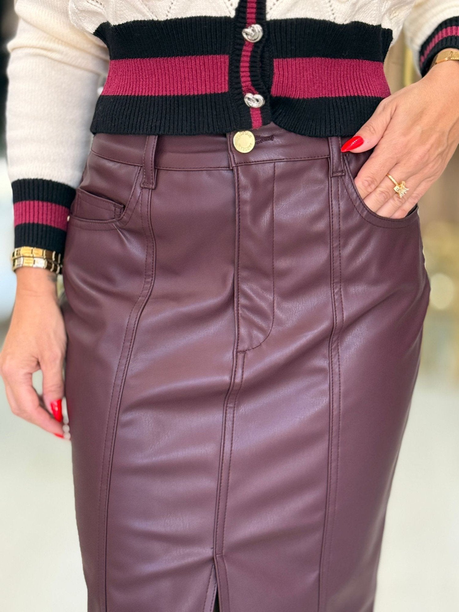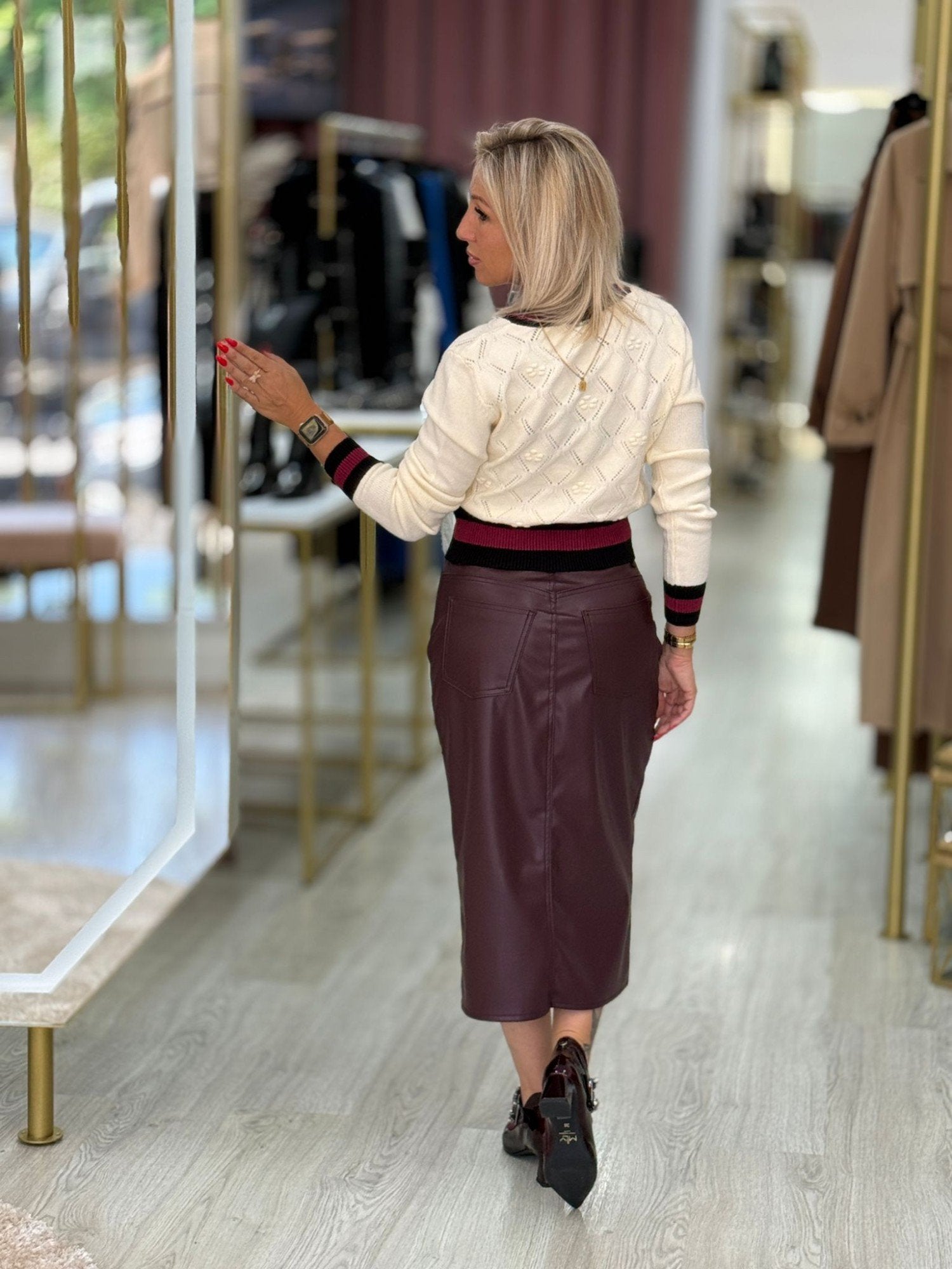 Saia ecopele midi de cintura subida com presilhas. Três bolsos à frente e dois bolsos de chapa atrás. Abertura na frente. Fecha na frente com botão dourado e fecho de correr oculto pelo tecido.