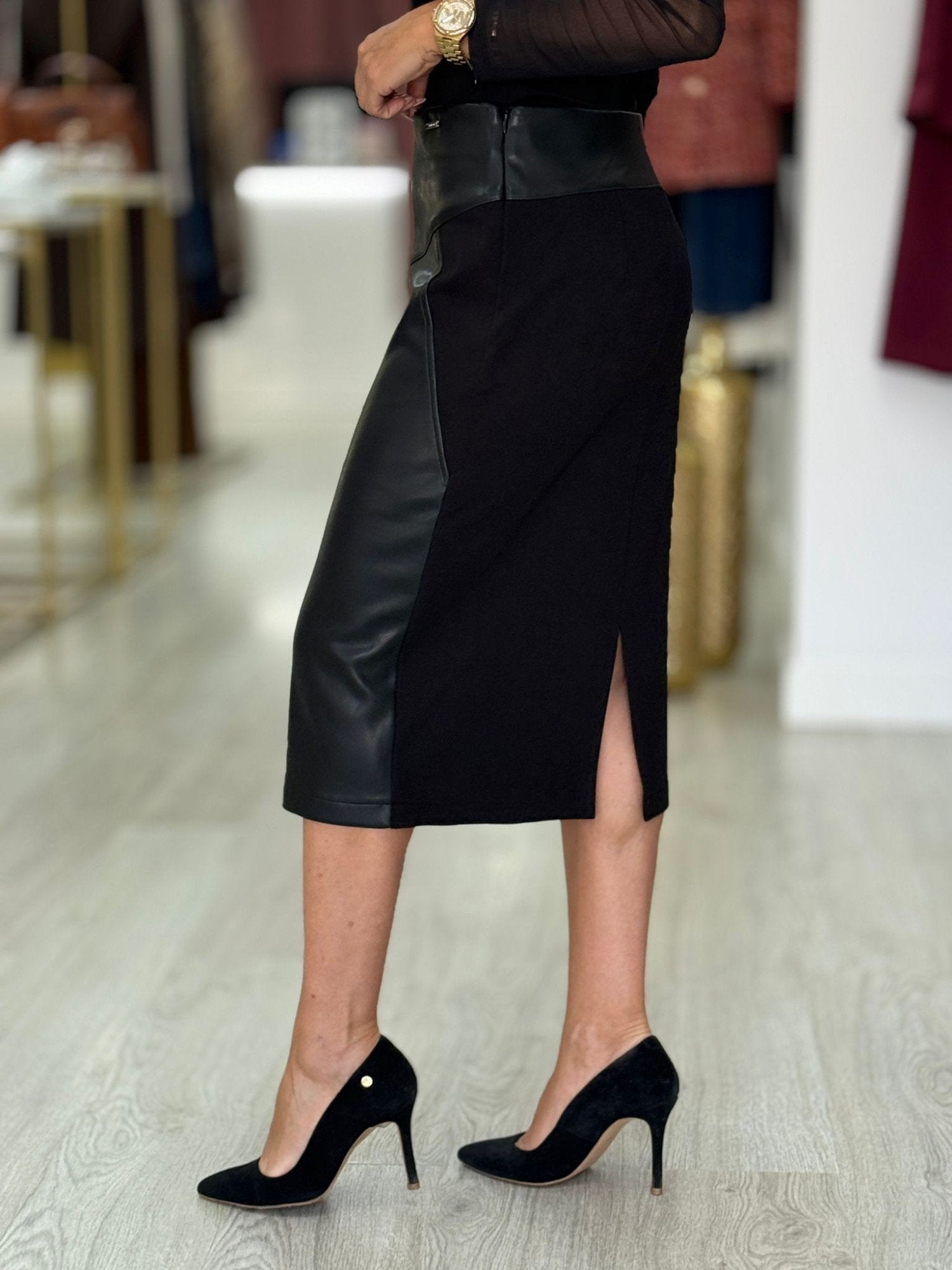 Saia justa em pele sintética na frente e em tecido na parte de trás. Modelo midi. Abertura atrás. Fecha com fecho de correr invisível na lateral.