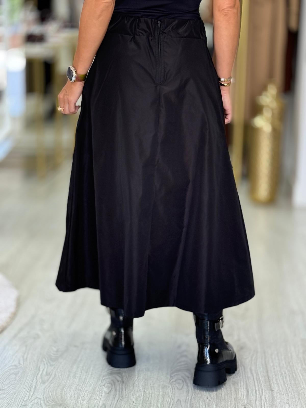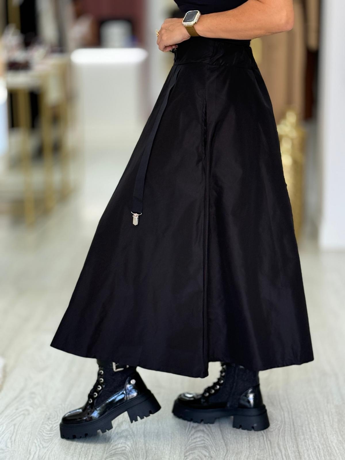 Saia midi com 2 bolsos e detalhes em prata no cós. Suspensórios decorativos. Tem elástico na parte de trás do cós fecha com fecho.