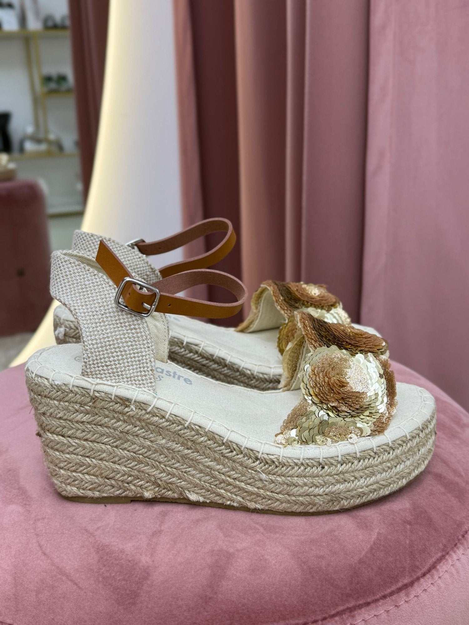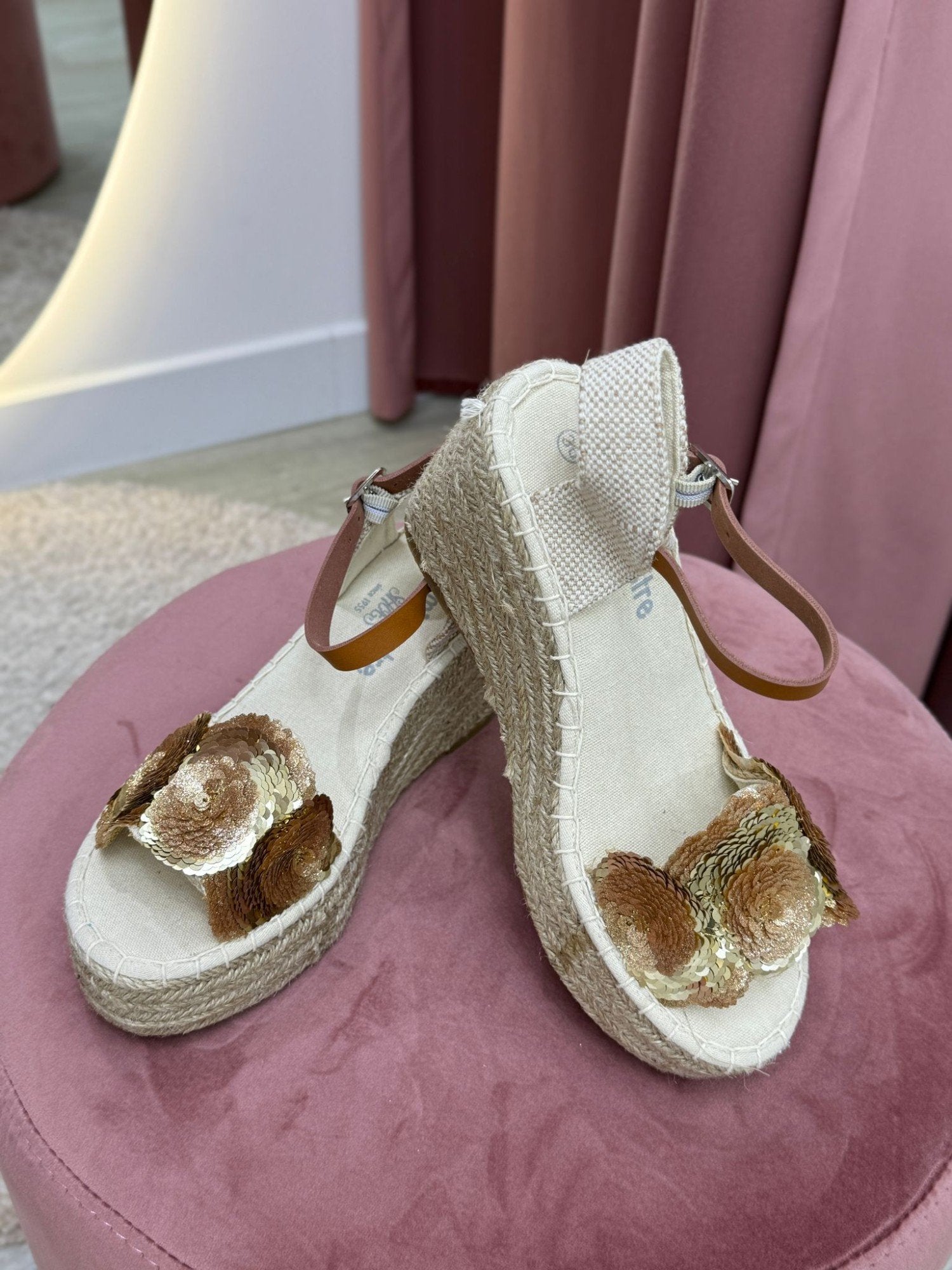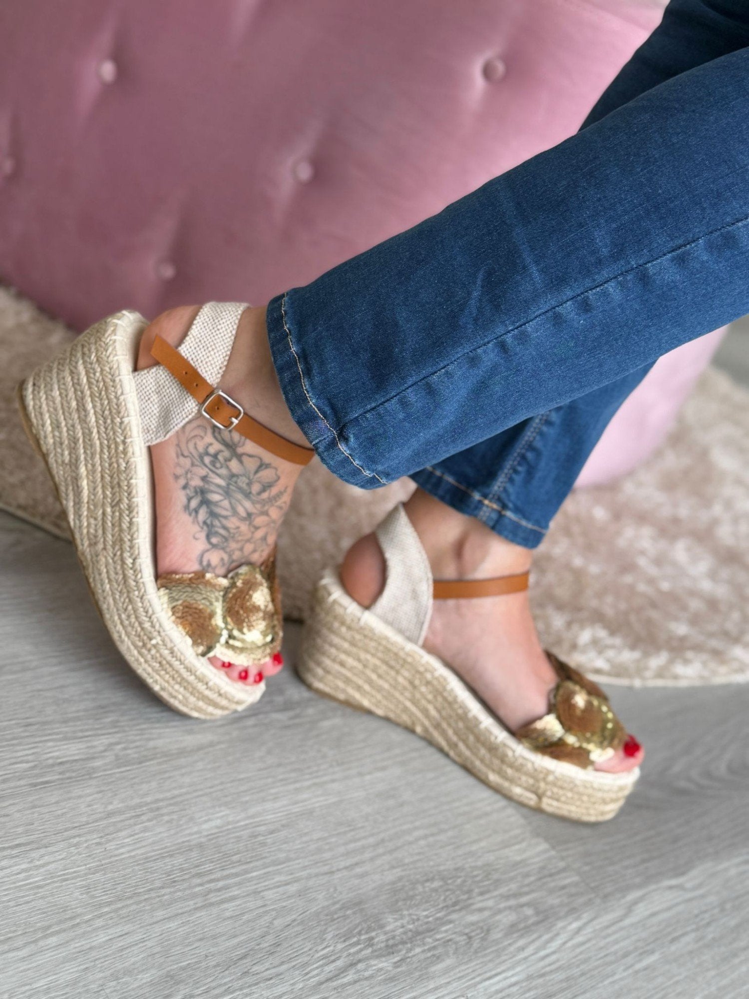 Sandálias de cunha de corda. Fecho no tornozelo com fivela na parte externa.