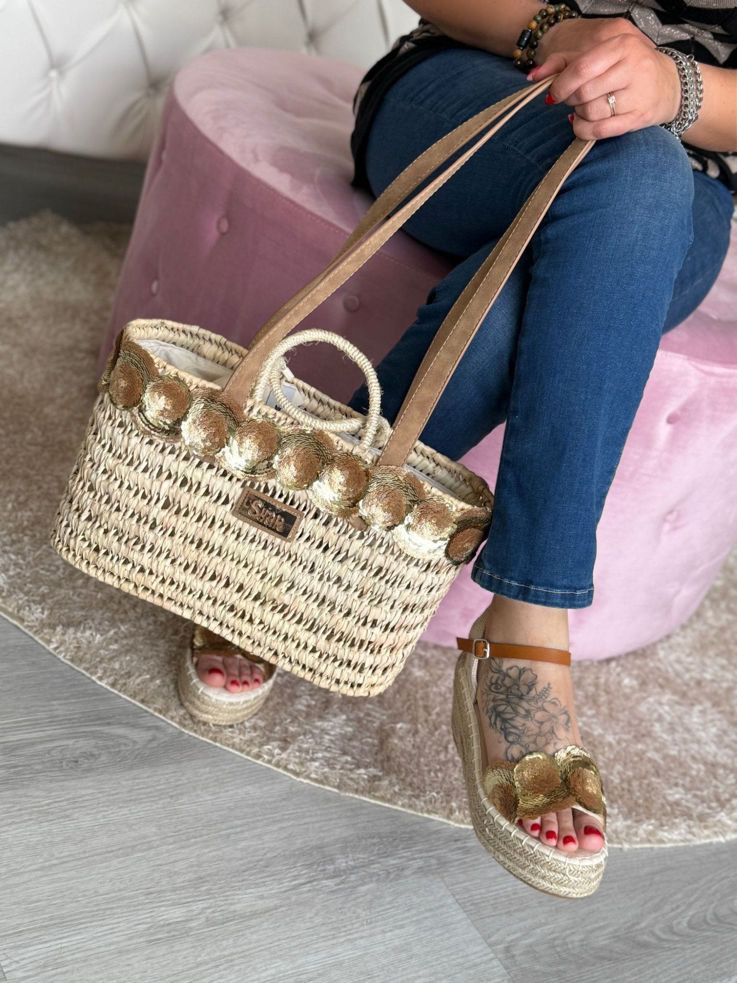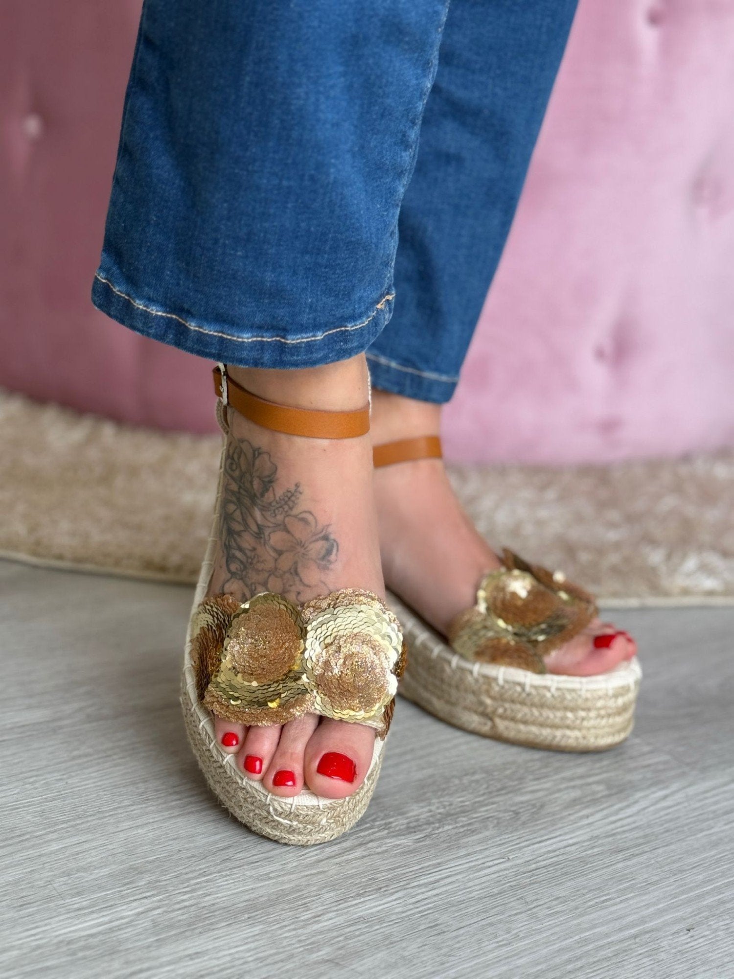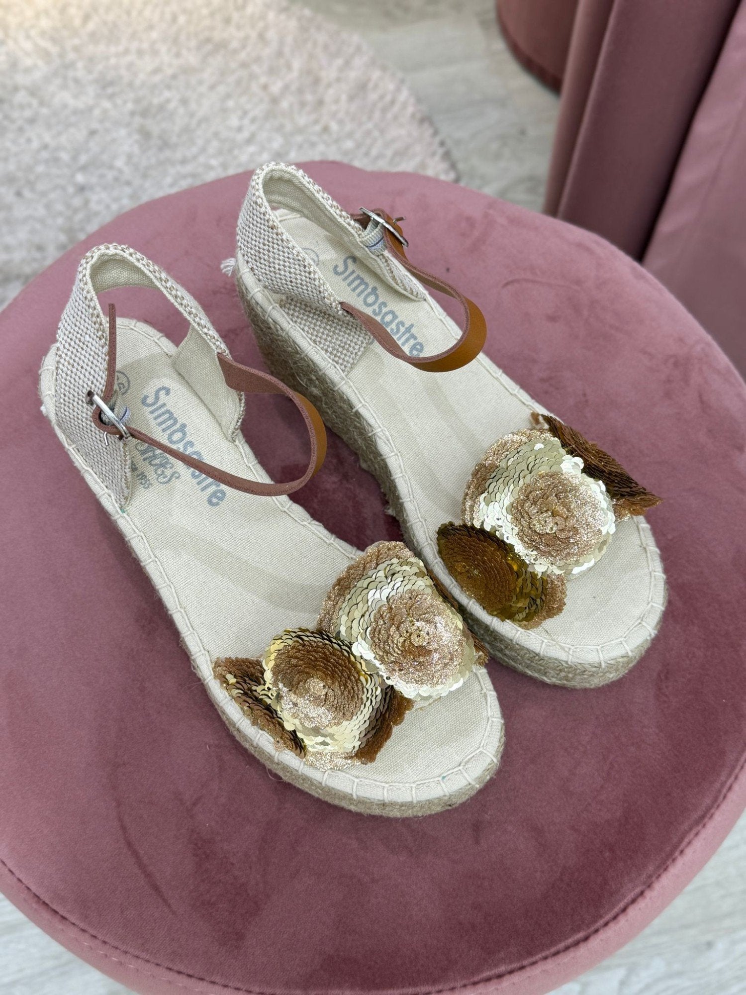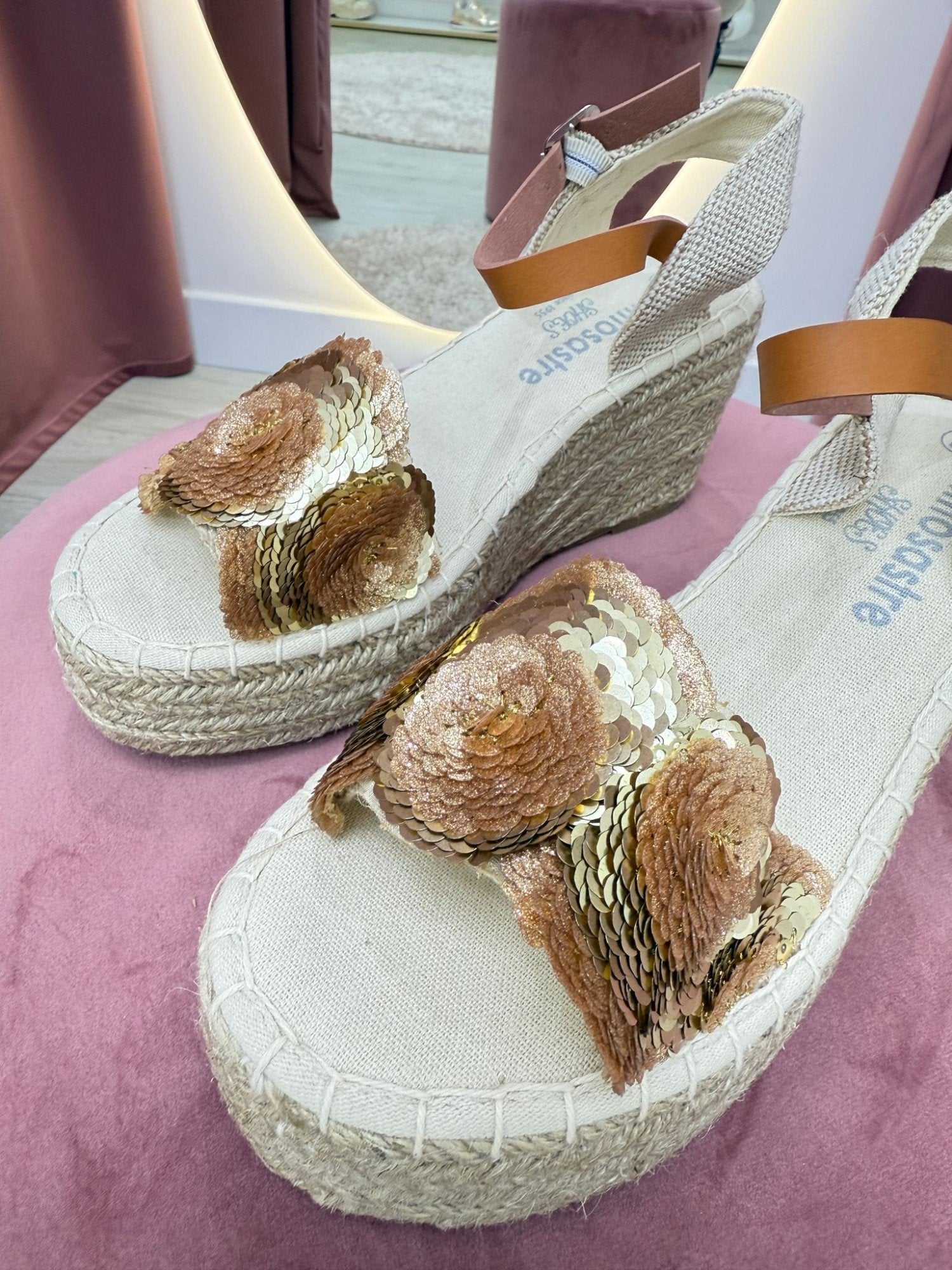 Sandálias de cunha de corda. Fecho no tornozelo com fivela na parte externa.