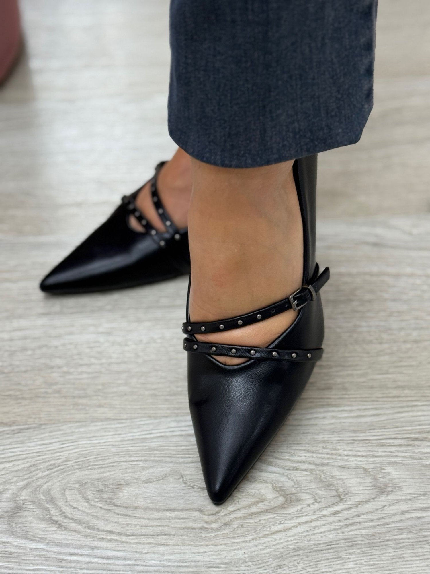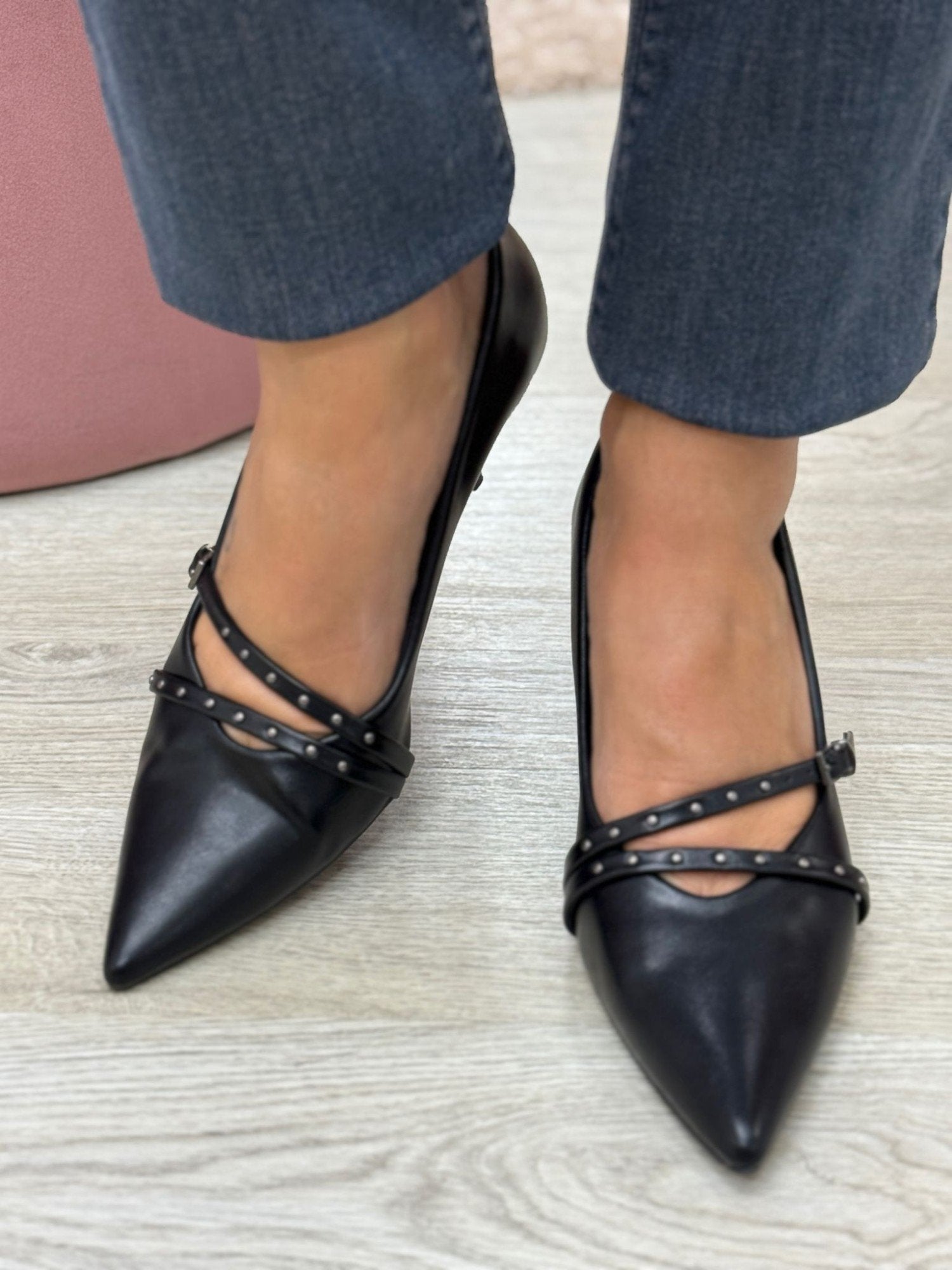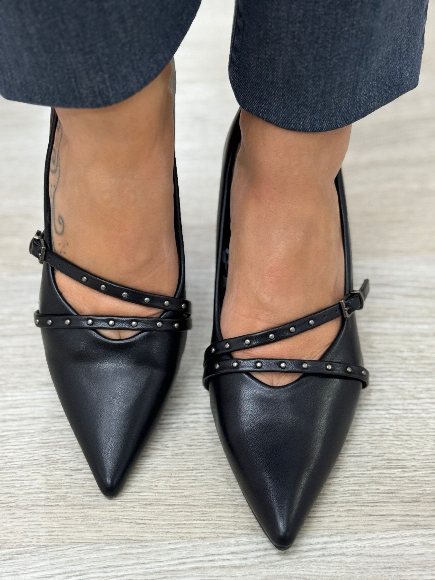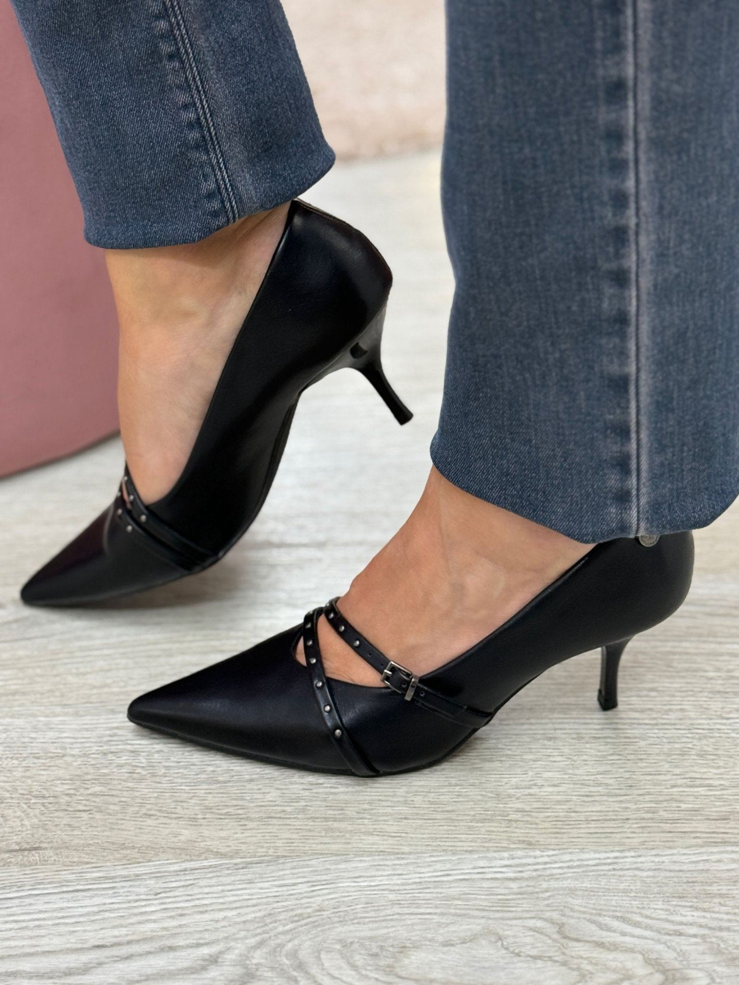 Sapato de salto alto com 7 cm. Feito em pele sintética. Fechamento na frente fivela.