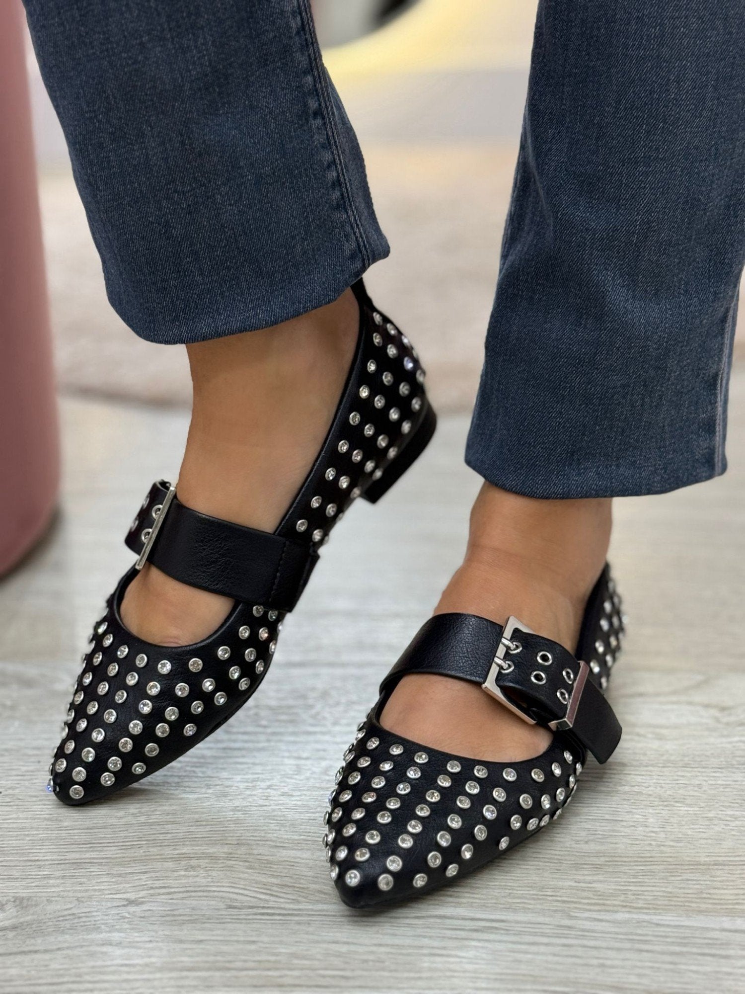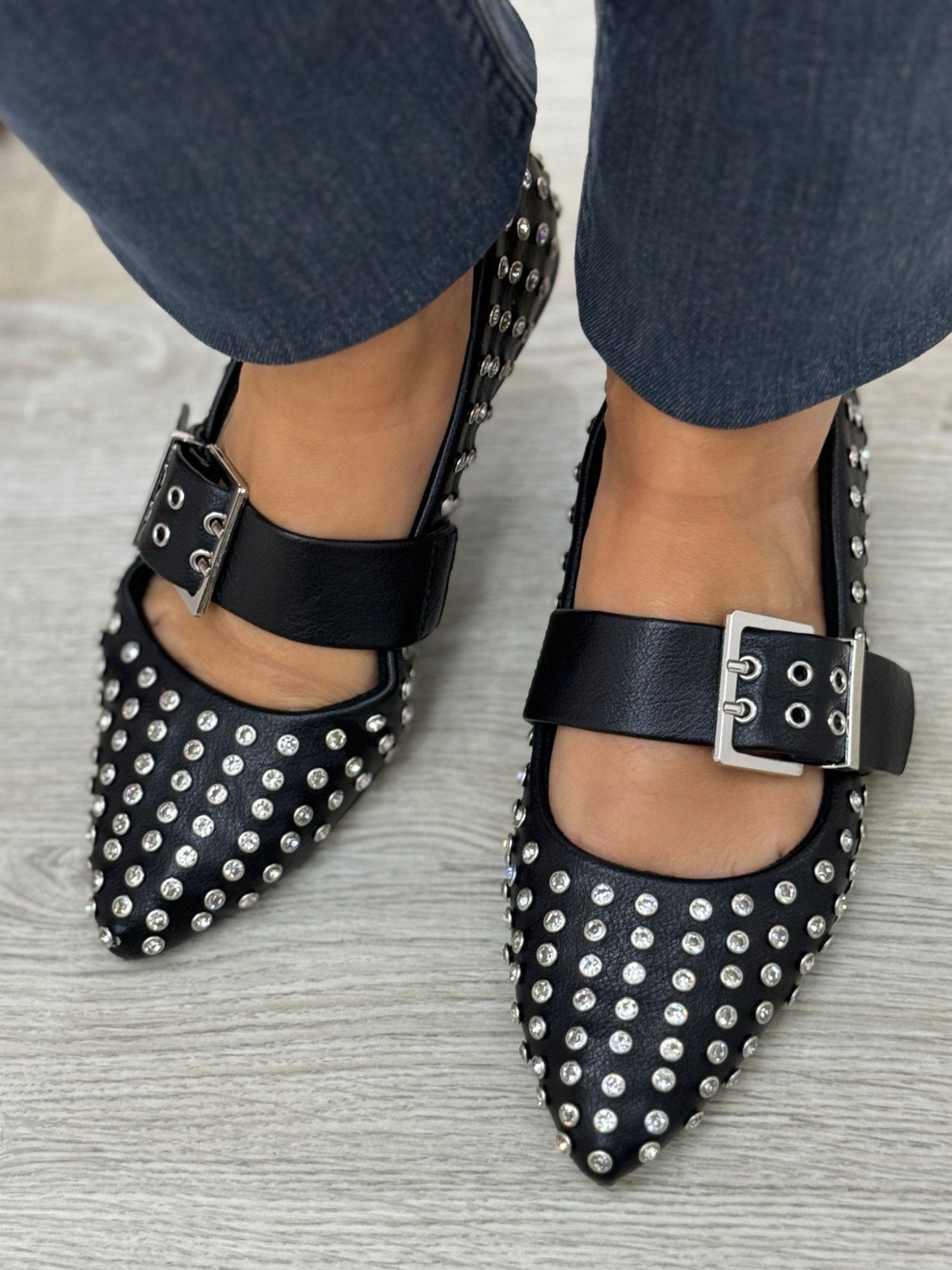 Sapatos femininos da marca Xti. Feitos em couro sintético, decorados com tachas que incorporam cristais brilhantes, adicionando um toque de estilo e sofisticação. Você pode ajustar cinco tachas para garantir um ajuste perfeito. Design elegante e moderno, ideal para adicionar um toque de distinção e conforto aos seus looks. Piso antiderrapante.