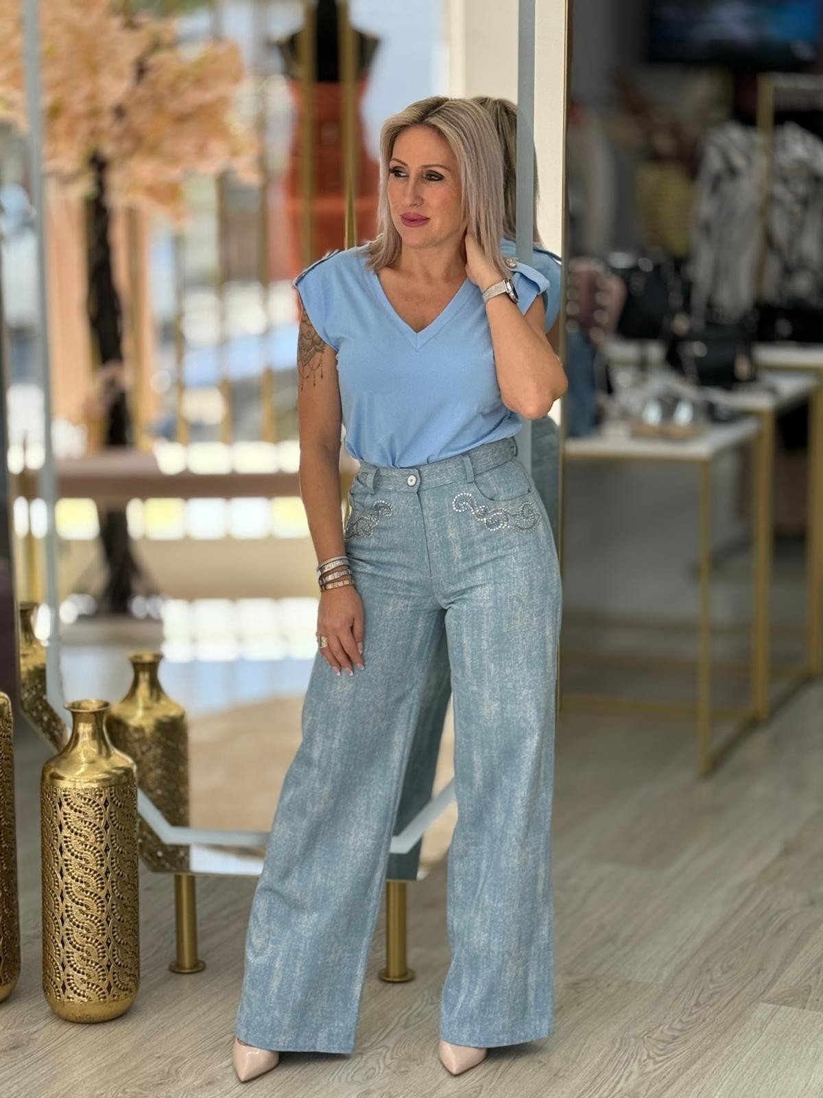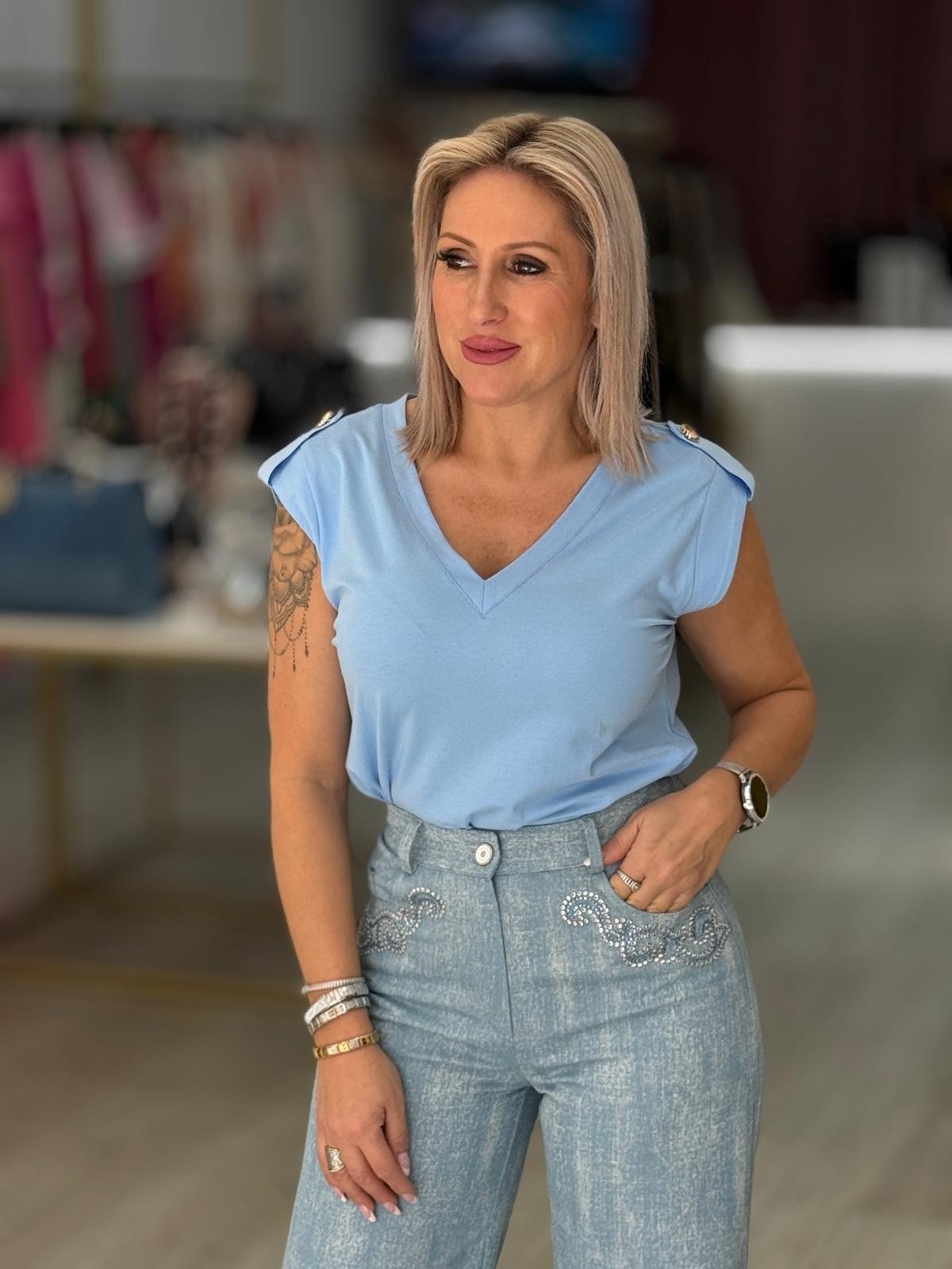 T-shirt de decote em V, sem mangas. Com aplicação de botão nos ombros.