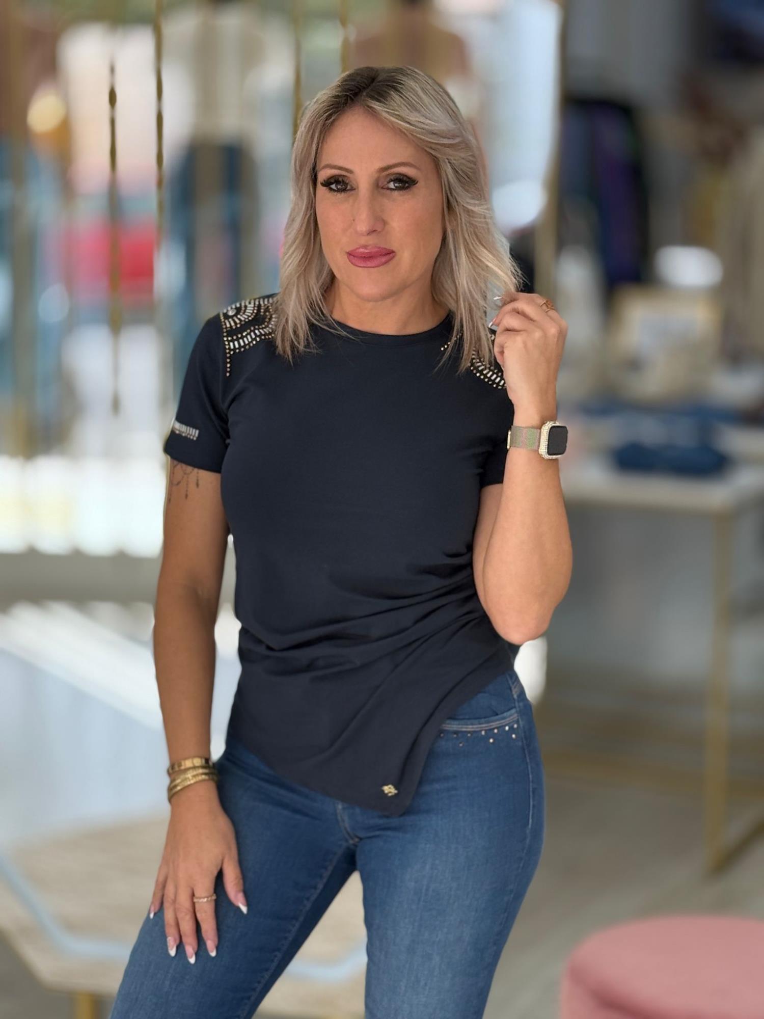 T-shirt de decote redondo com franzido de um dos lados. Manga curta com aplicação de tachas na manga e nos ombros.
