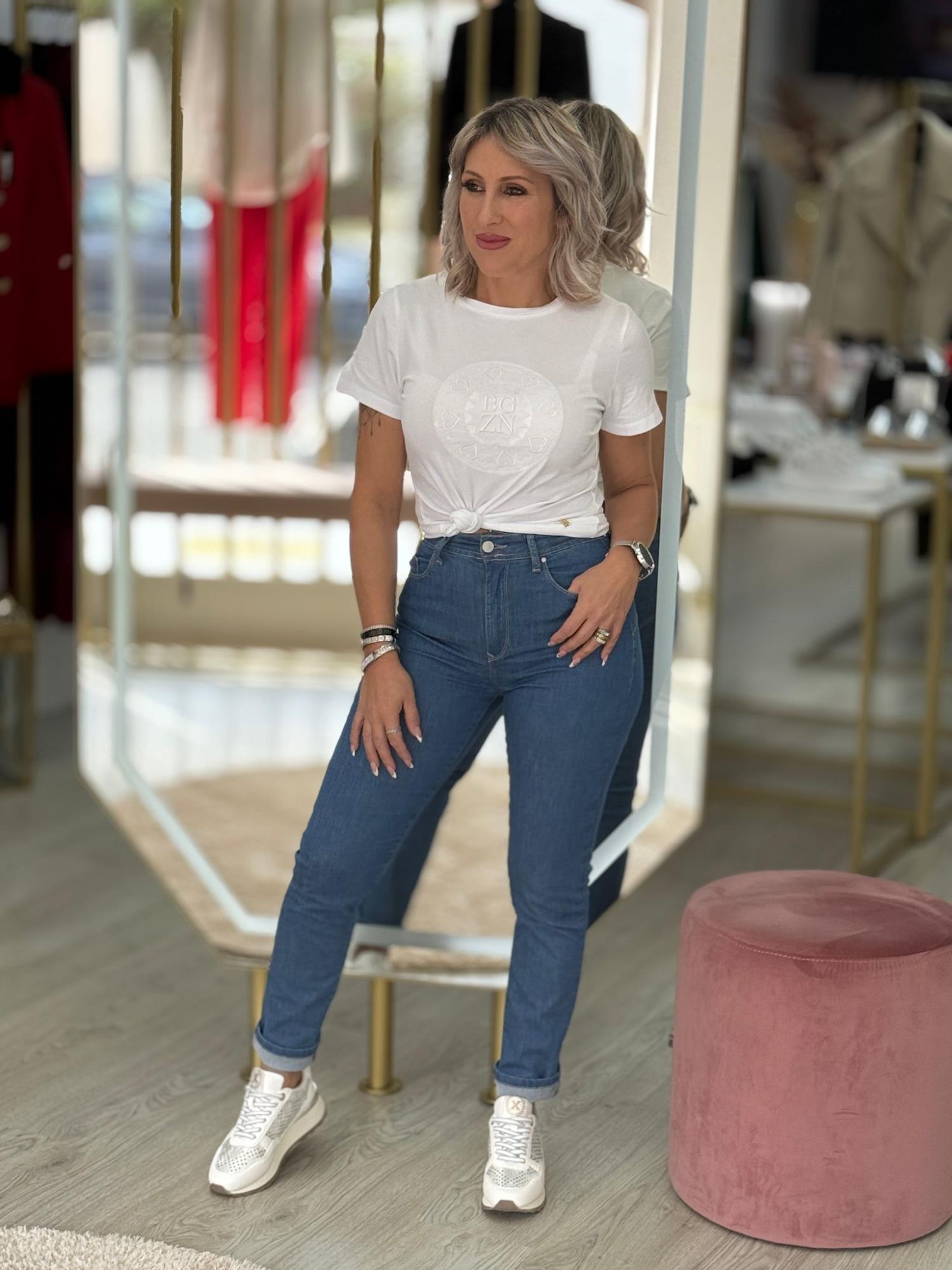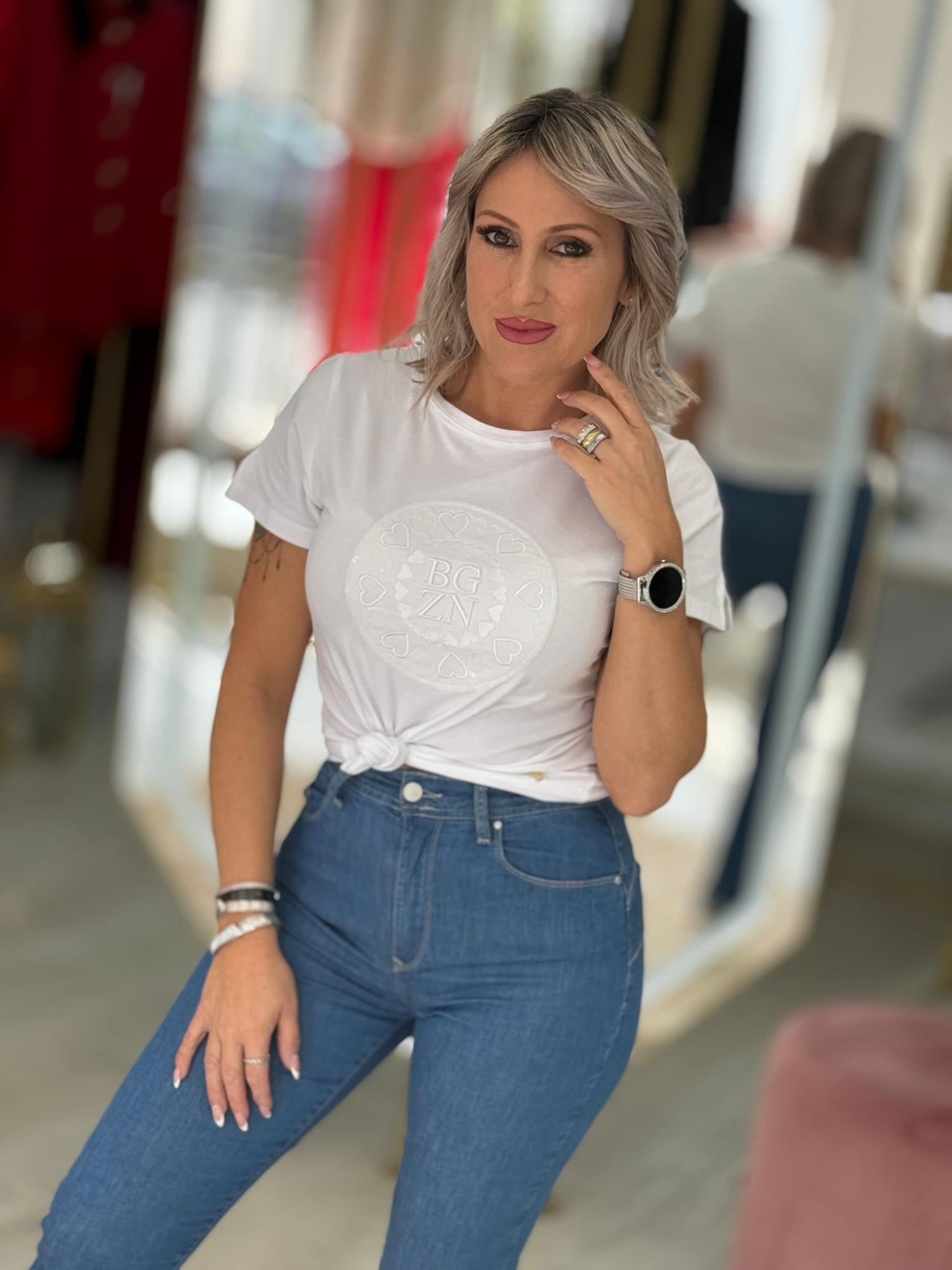 T-shirt de decote redondo e manga curta. Com corações com lantejoulas e em relevo.
