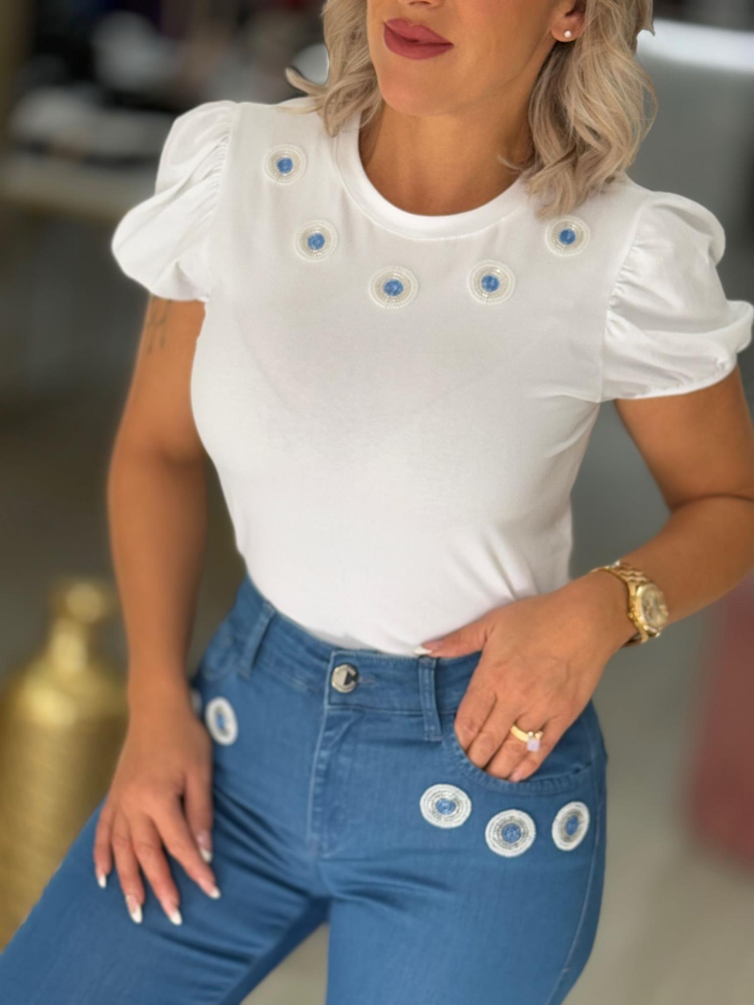 T-shirt manga curta. Decote redondo. Detalhe de aplicações na frente com missangas.