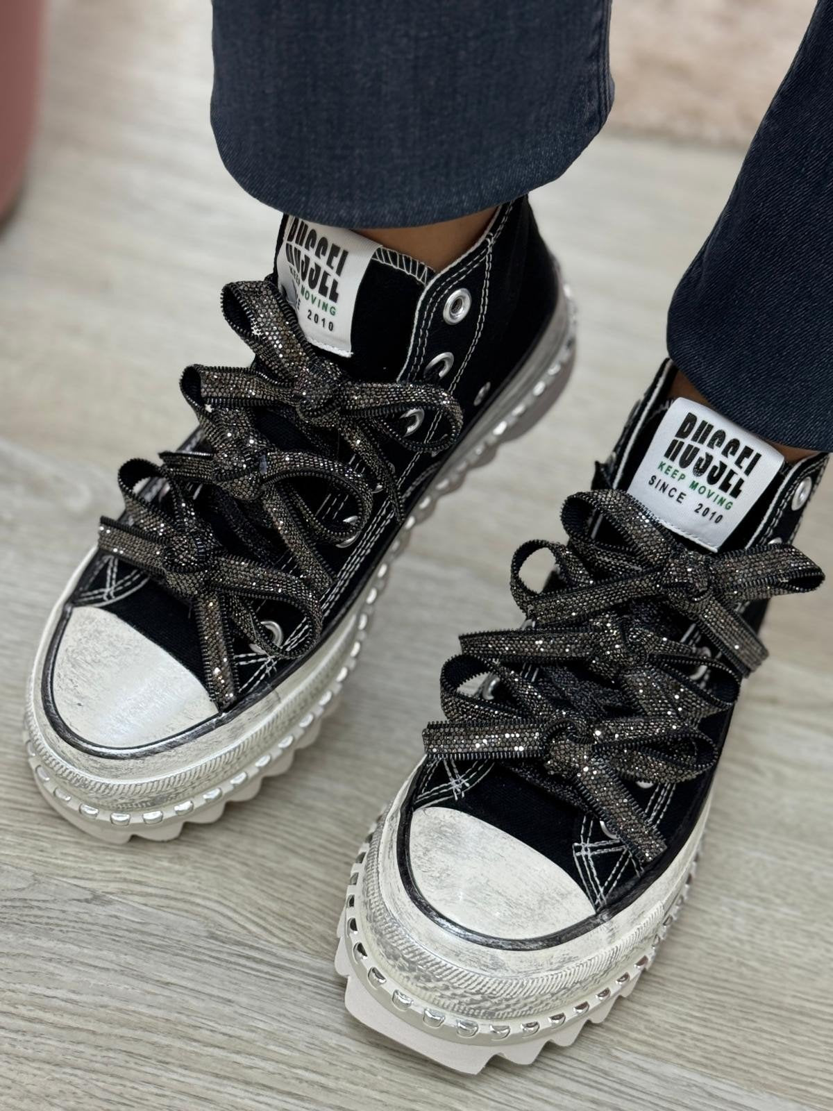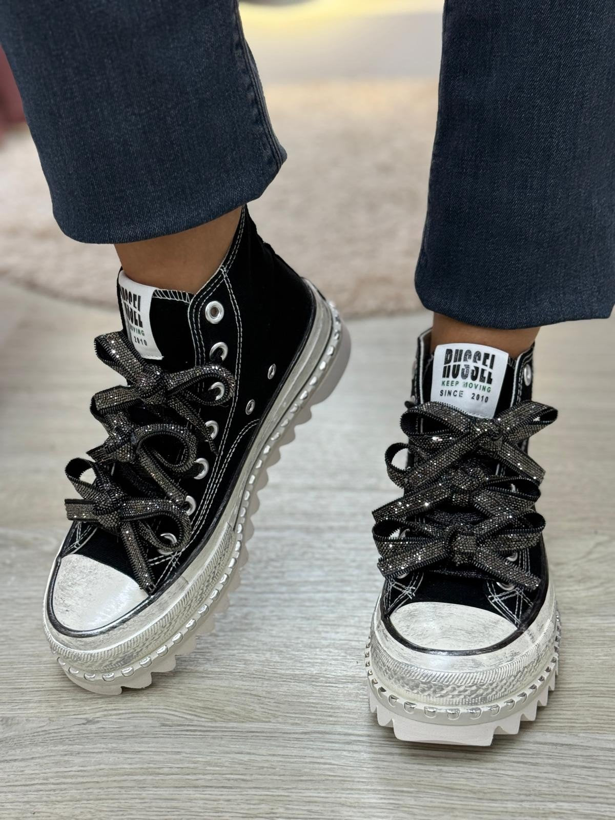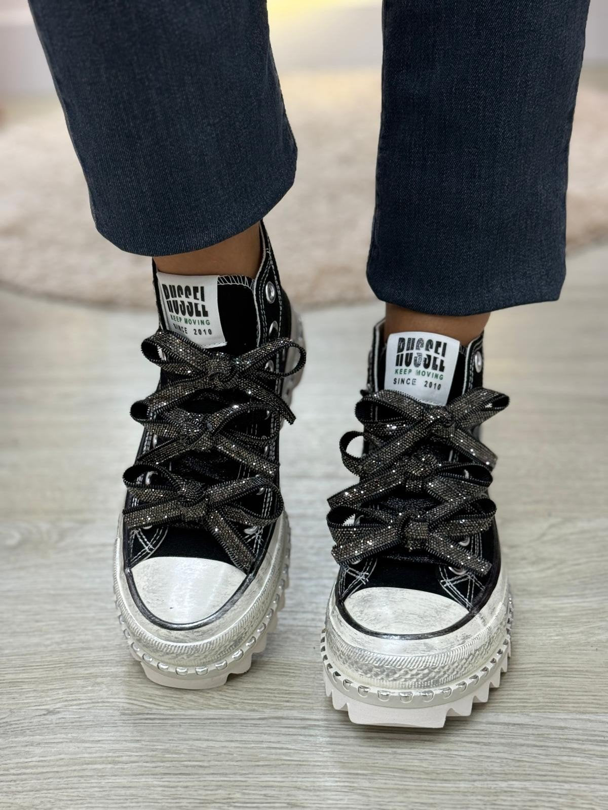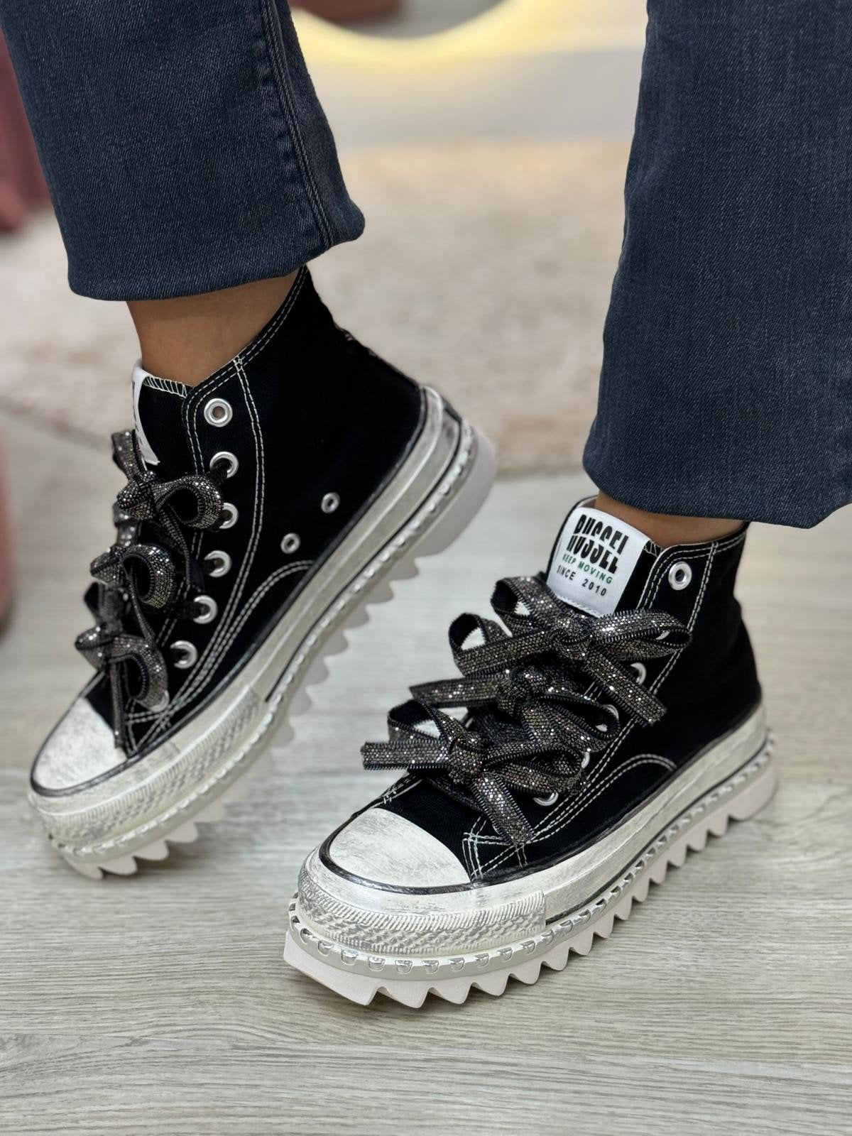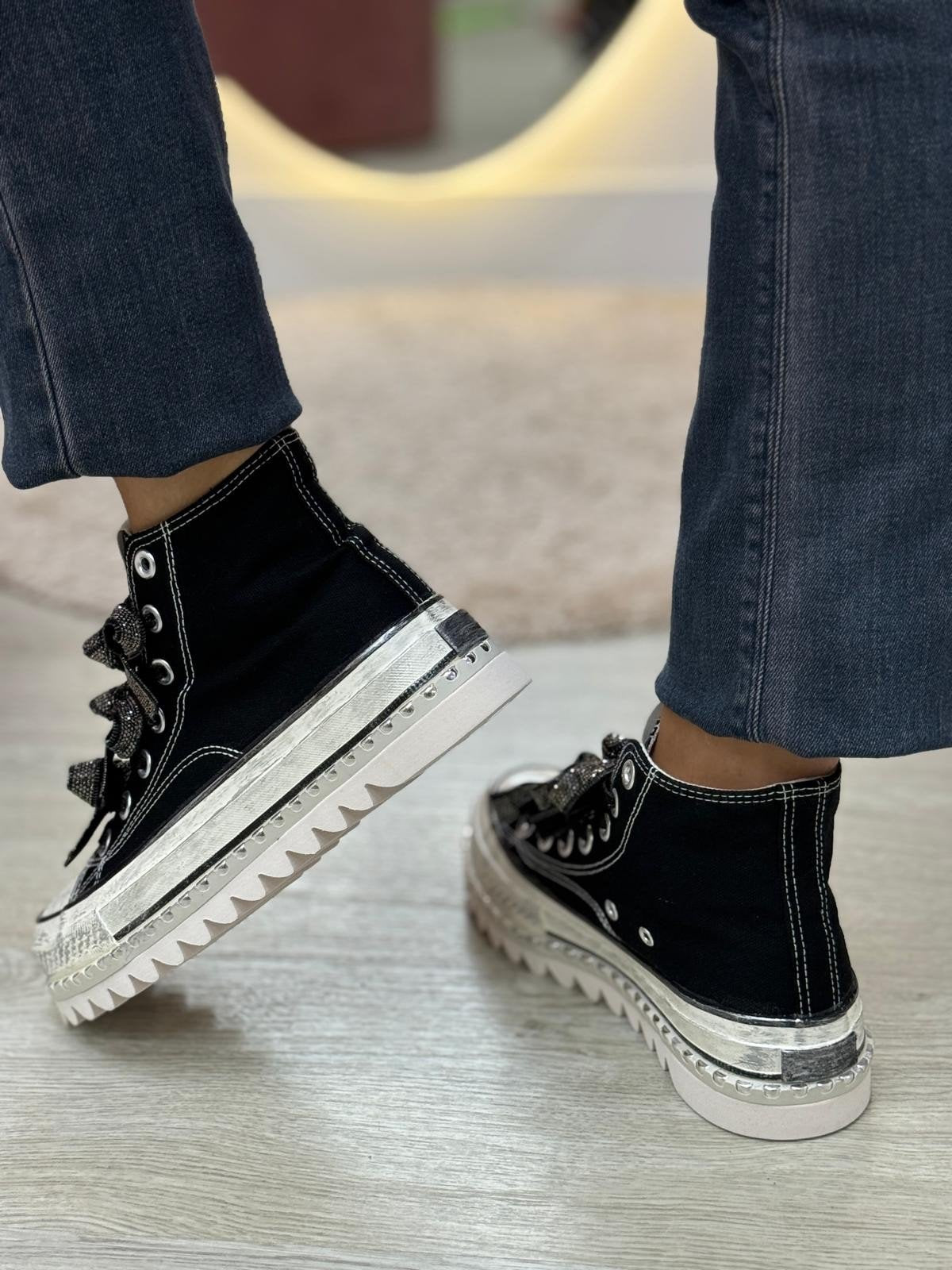 Ténis botas com sola compensada e atacadores com strass. O calçado da conceituada marca Russel Matos com materiais de alta qualidade. Perfeitas para o dia a dia, garantindo o conforto, bom andar e resistência que precisa. Modelos práticos, versáteis e confortáveis. Sempre a seguir as tendências do calçado feminino. Material em pele com tecido interior, sola de borracha, palmilha personalizada pela marca.