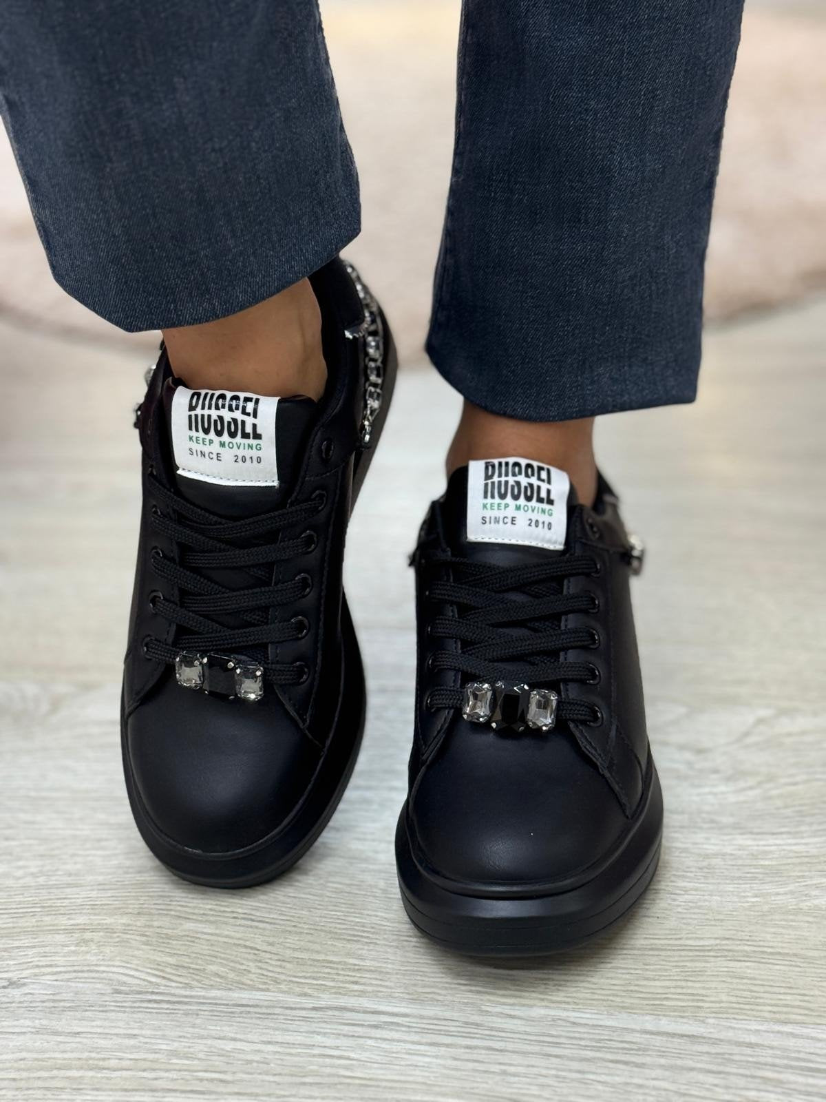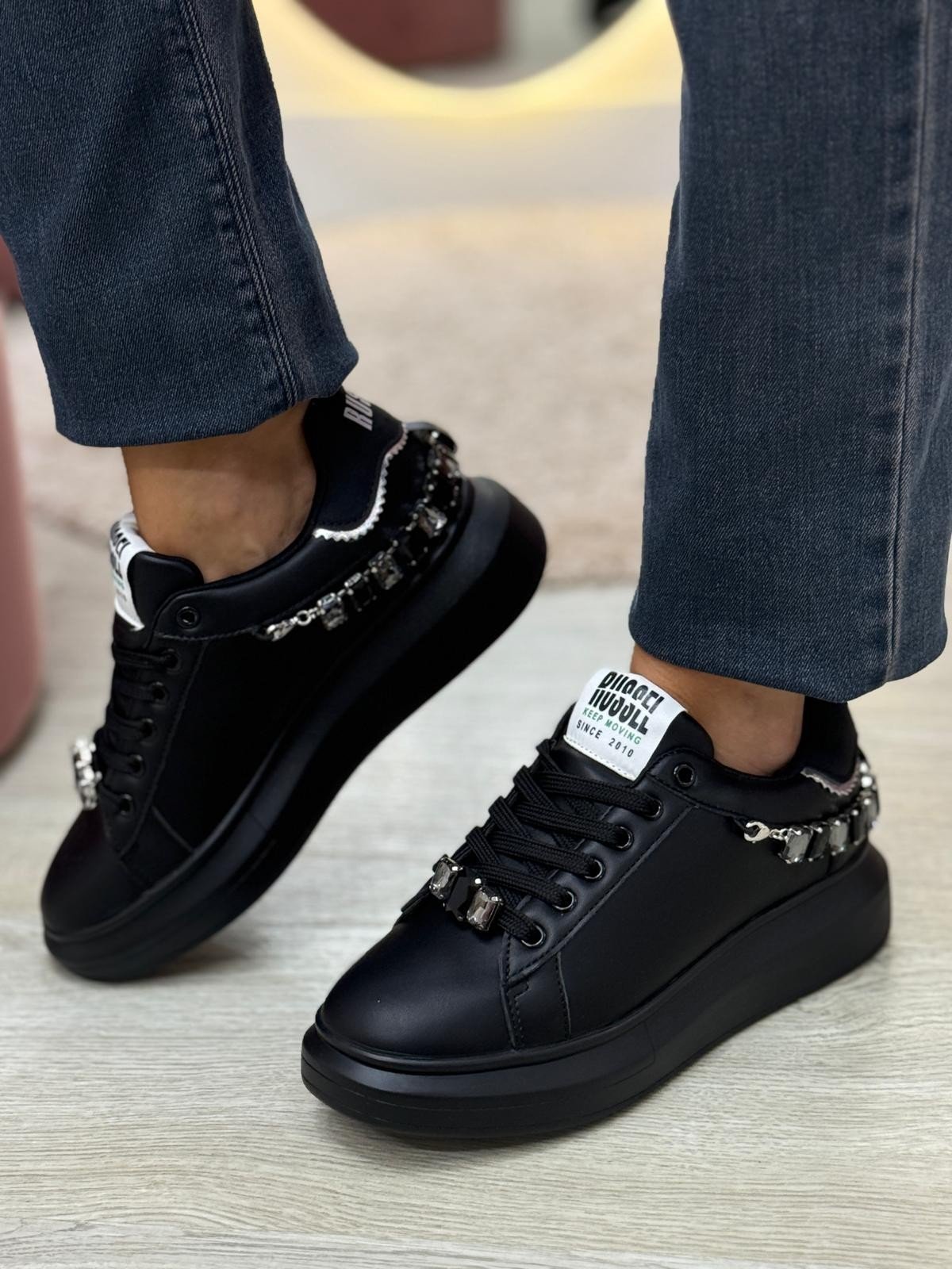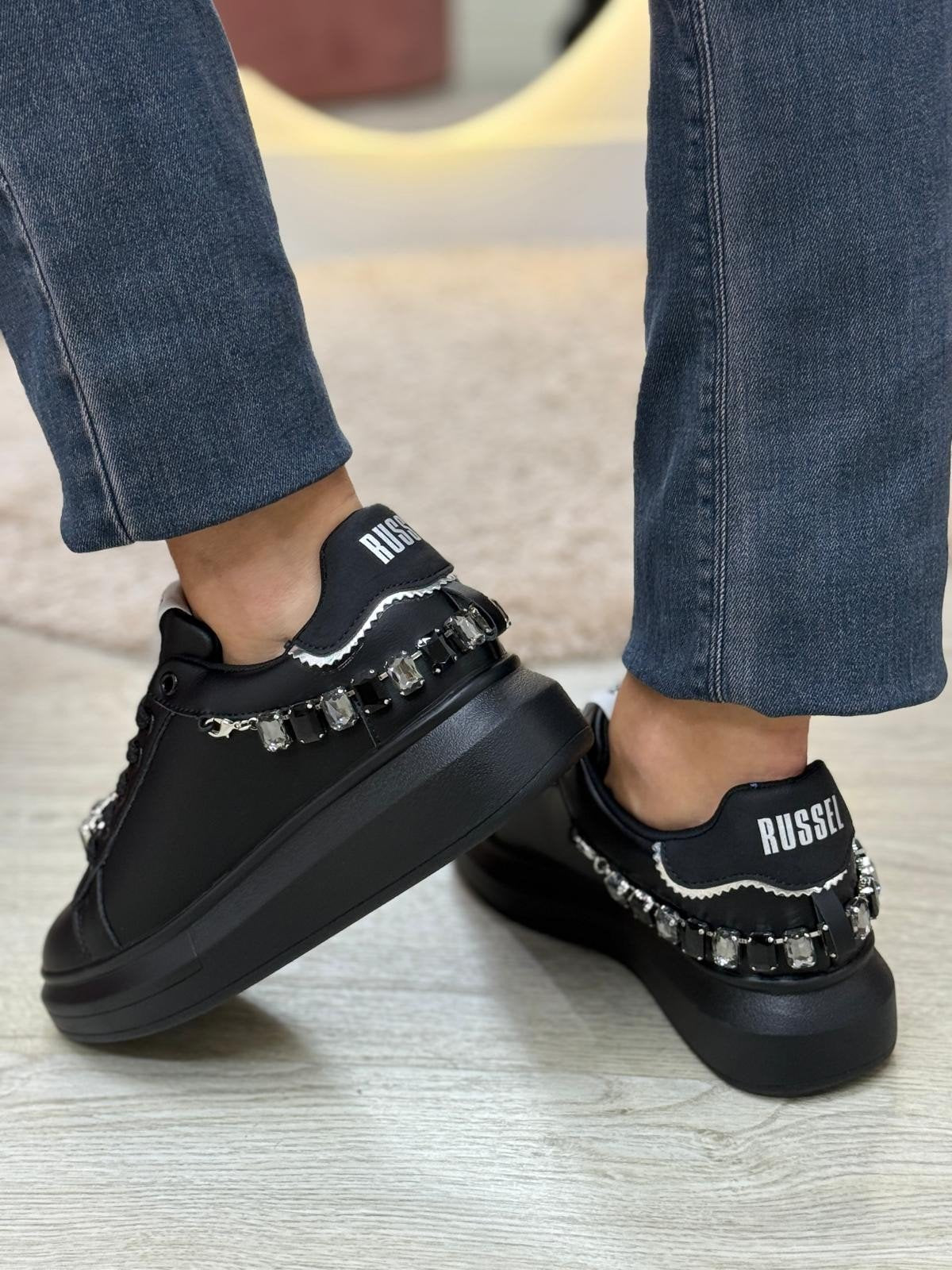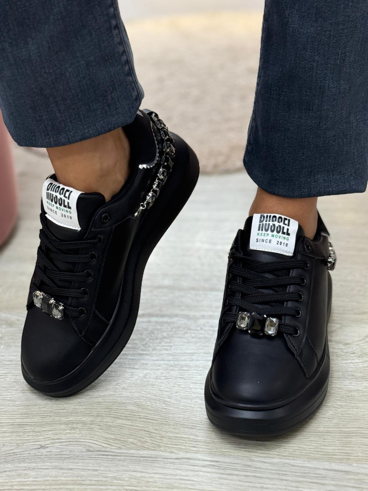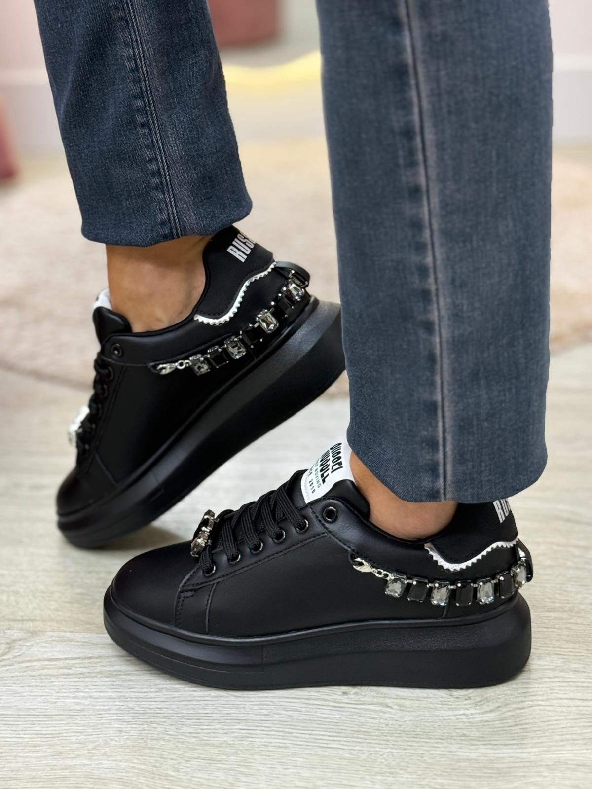 Ténis MILL BLACK com pedraria no atacador e atrás. Perfeitas para o dia a dia, garantindo o conforto, bom andar e resistência que precisa. Modelos práticos, versáteis e confortáveis. Sempre a seguir as tendências do calçado feminino. Material em pele com tecido interior, sola de borracha, palmilha personalizada pela marca.