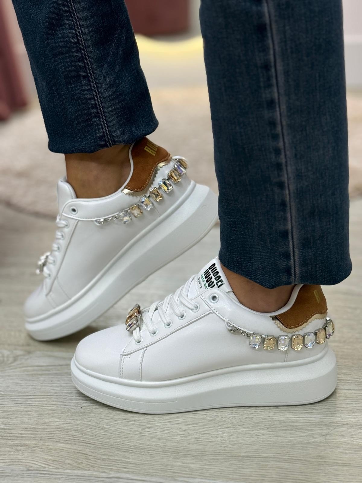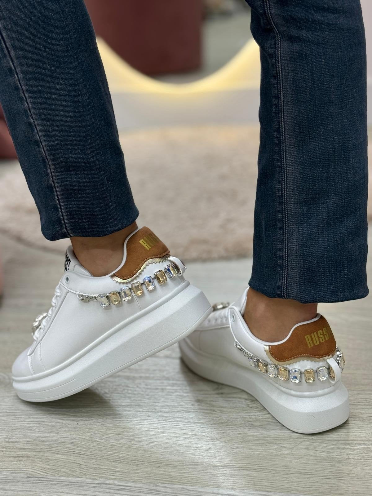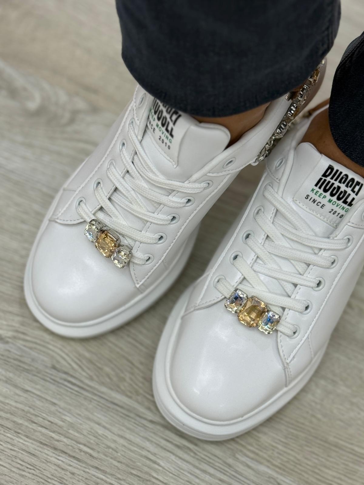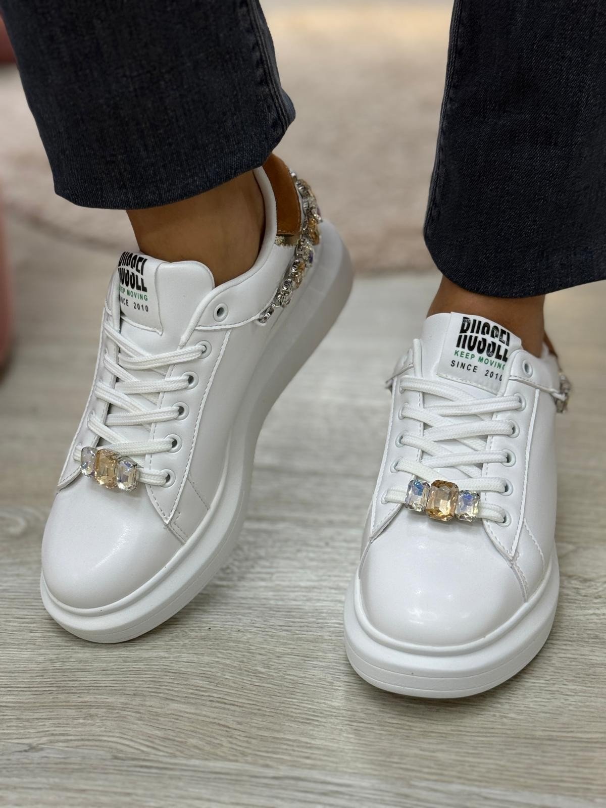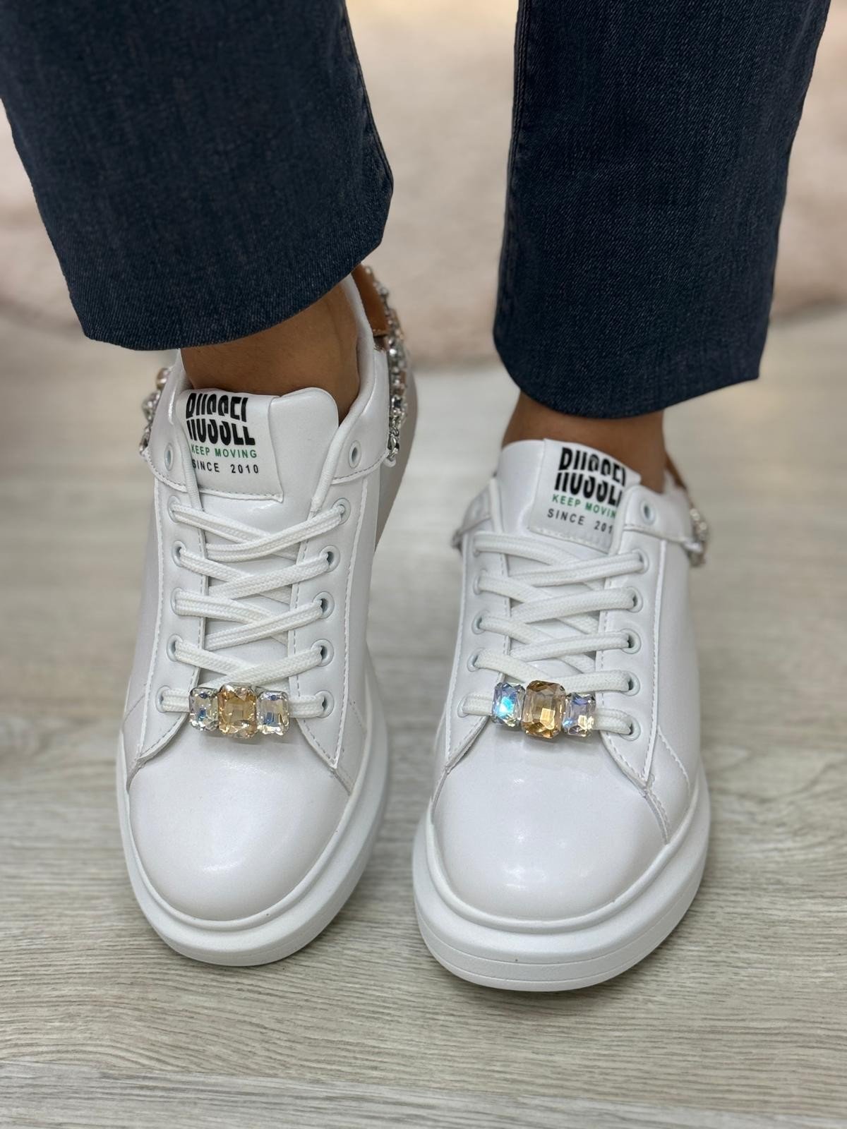 Ténis MILL WHITE com pedraria no atacador e atrás. Perfeitas para o dia a dia, garantindo o conforto, bom andar e resistência que precisa. Modelos práticos, versáteis e confortáveis. Sempre a seguir as tendências do calçado feminino. Material em pele com tecido interior, sola de borracha, palmilha personalizada pela marca.