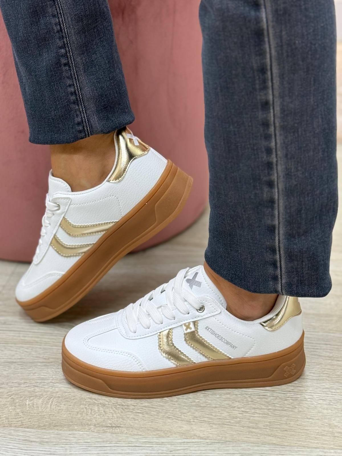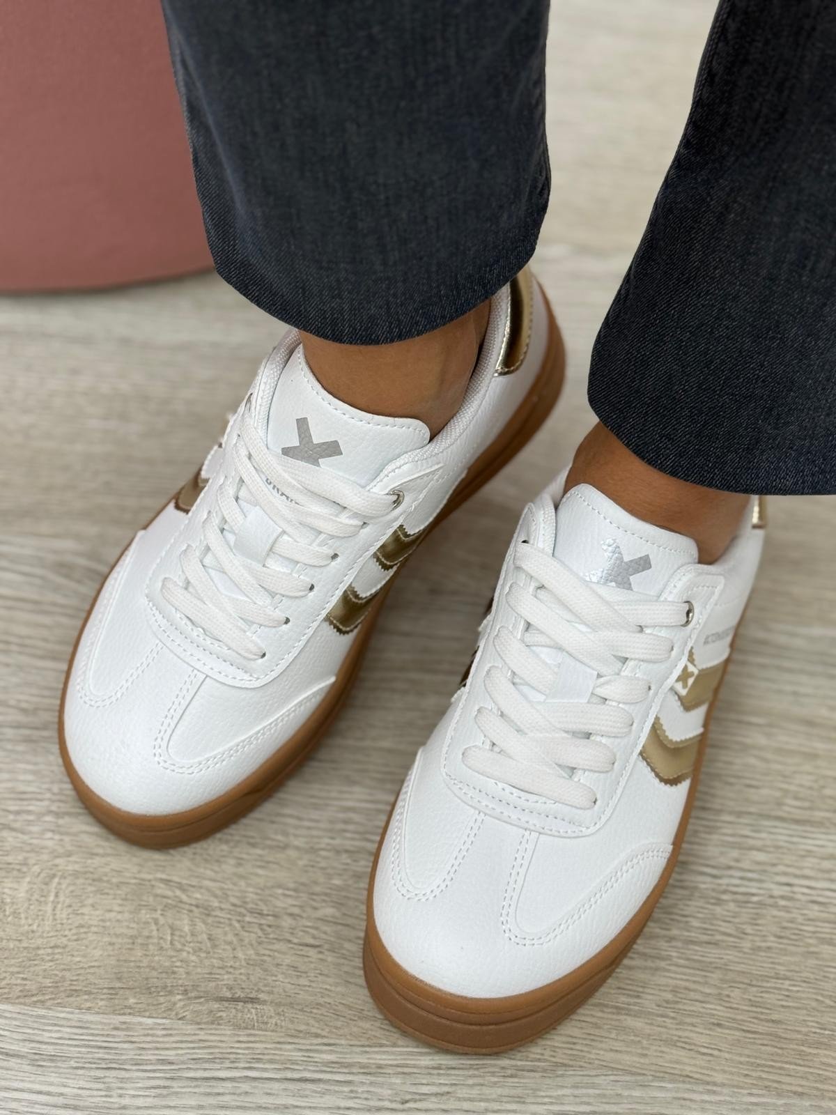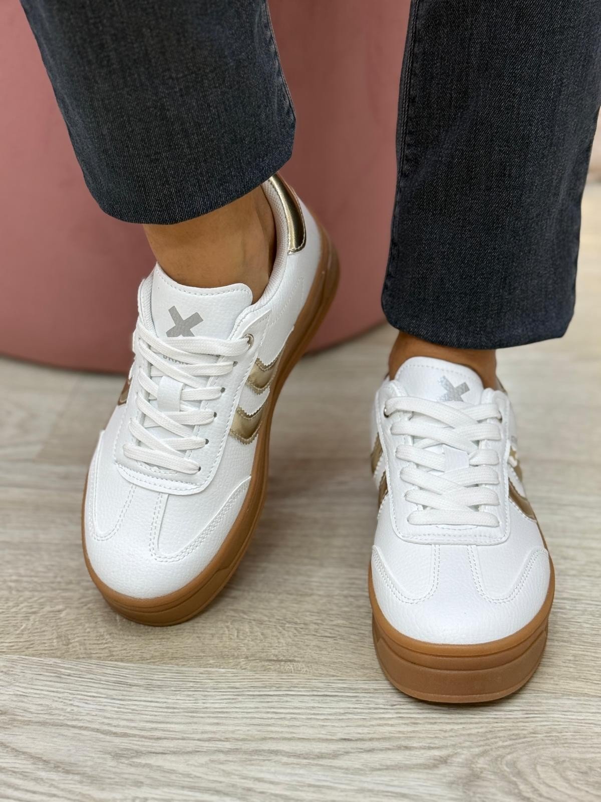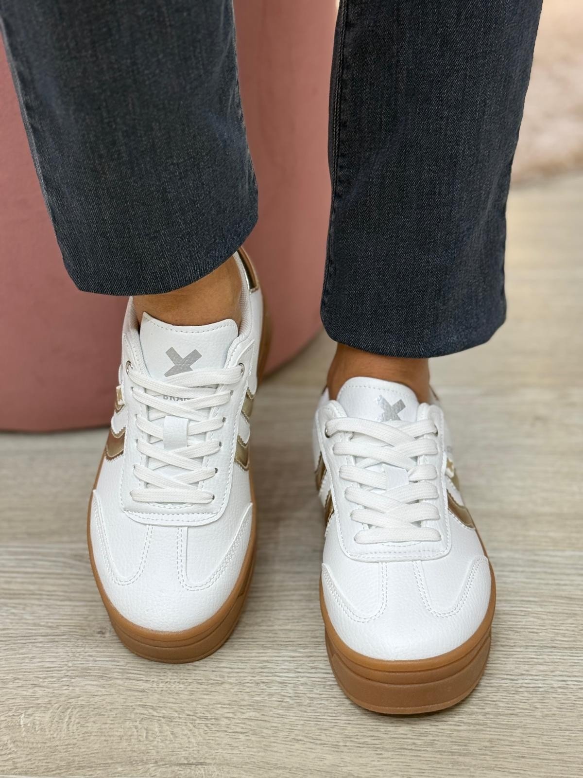 Ténis em pele sintética cor branco. Sola de borracha. Fechamento com atacadores.