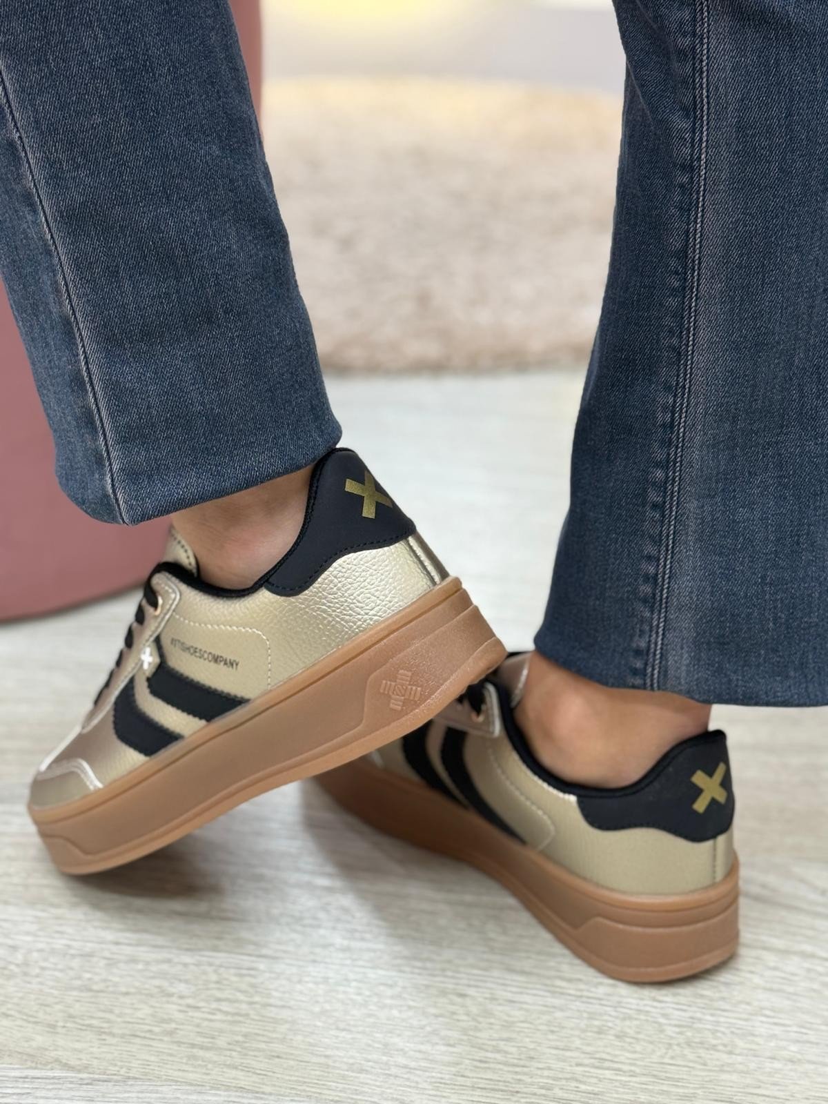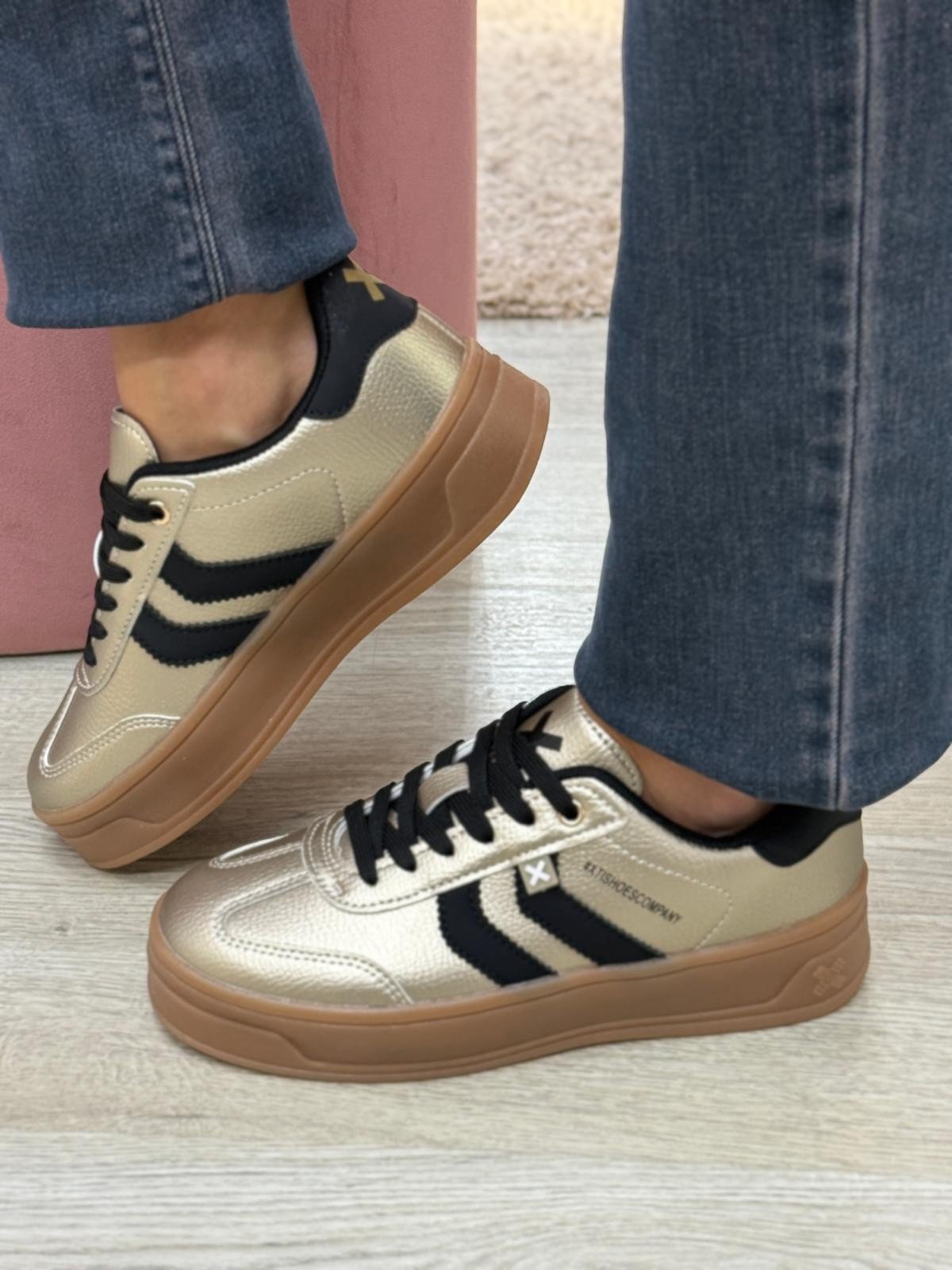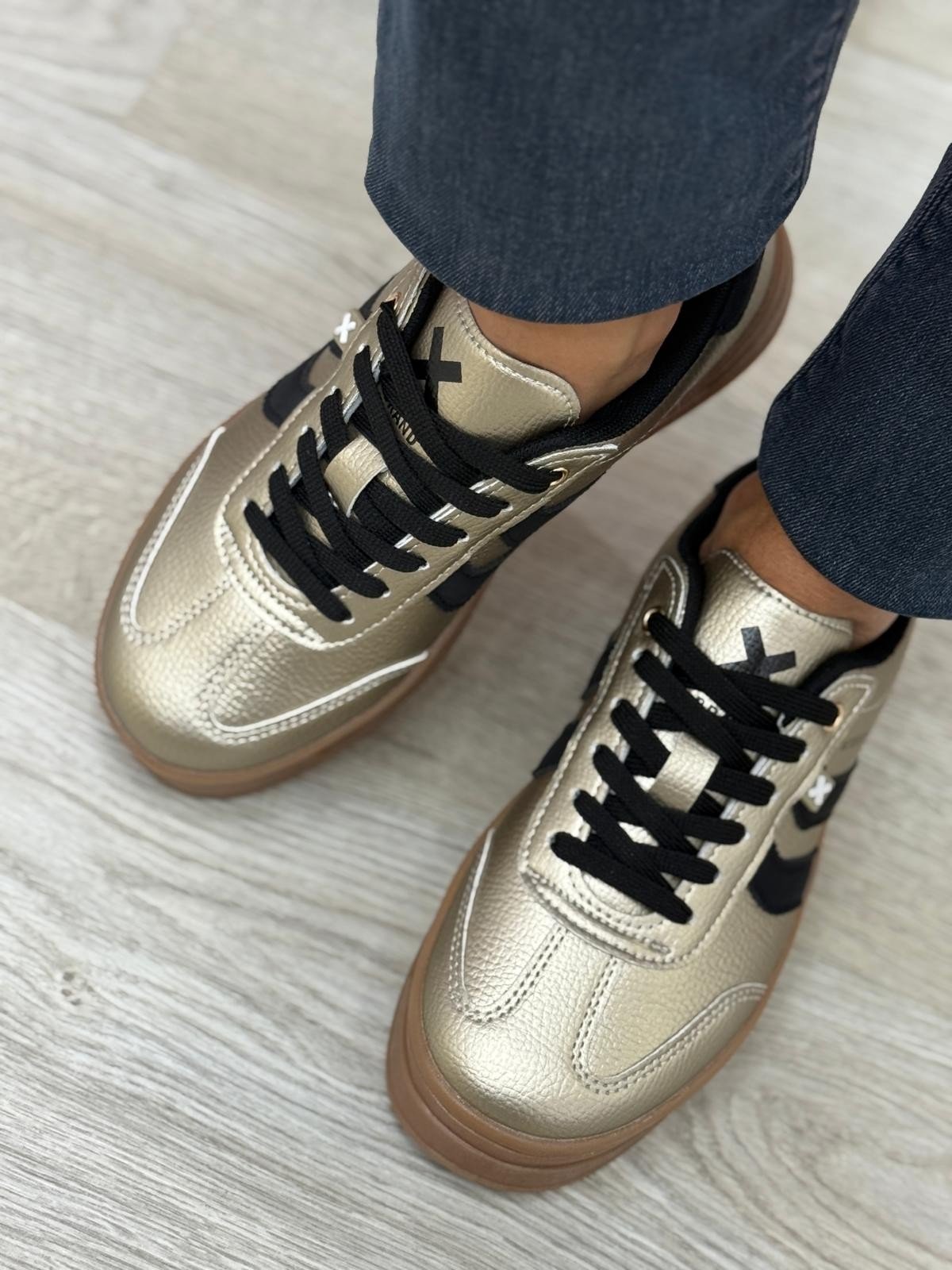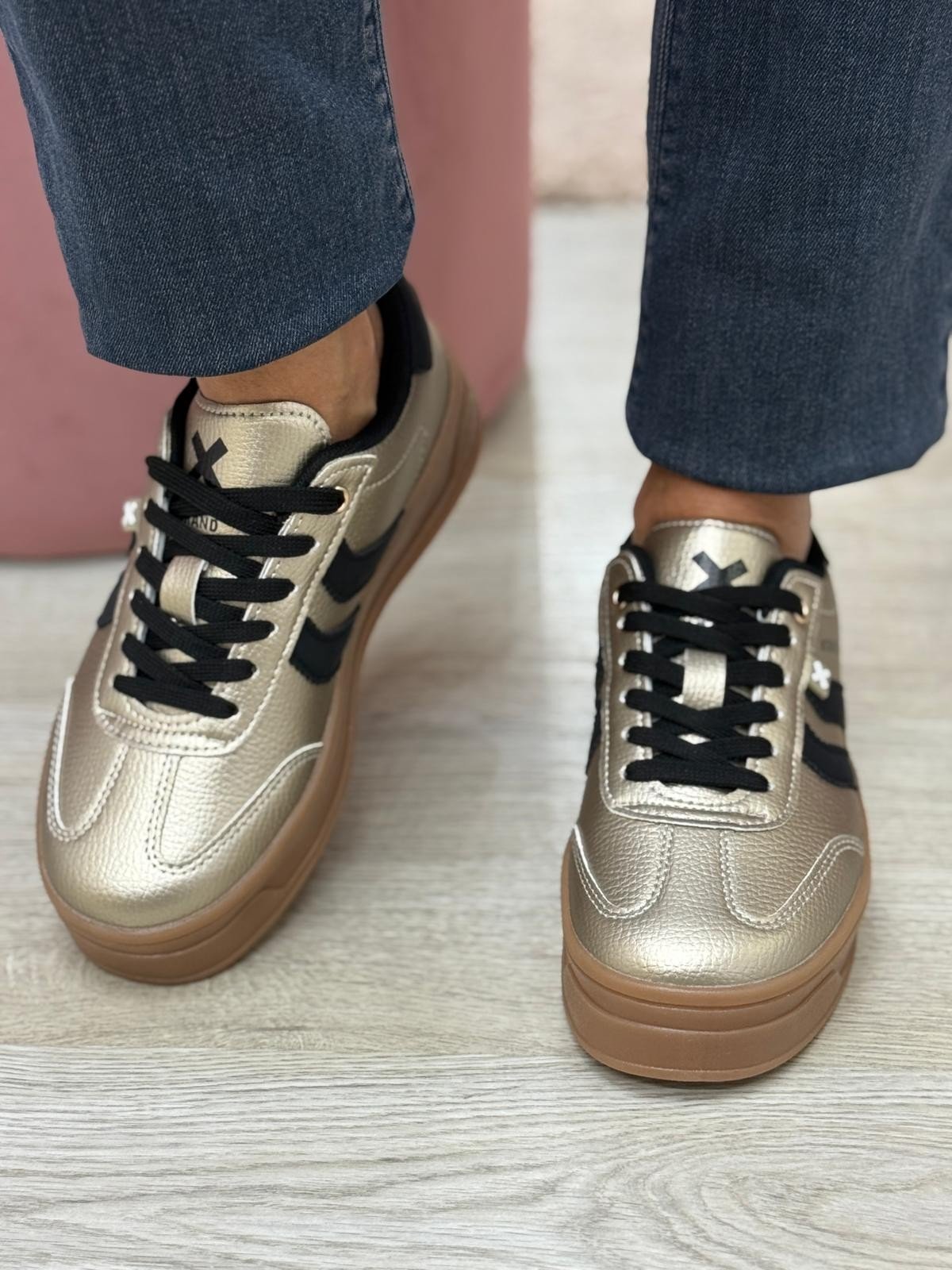 Ténis em pele sintética ouro. Sola de borracha. Fechamento com atacadores.