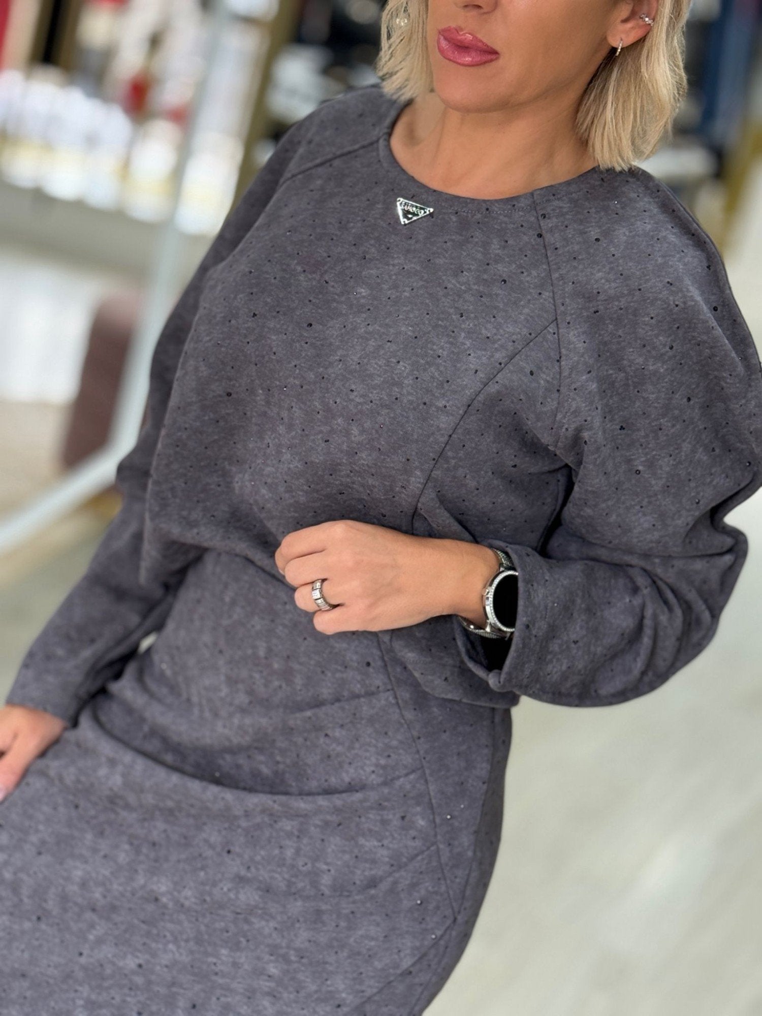 Top curto em tecido de acabamento pele de pêssego, caracterizado pelo toque aveludado e suave. As aplicações brilhantes criam um reflexo subtil e elegante sobre a superfície mate. Apresenta corte reto, mangas compridas e decote redondo.