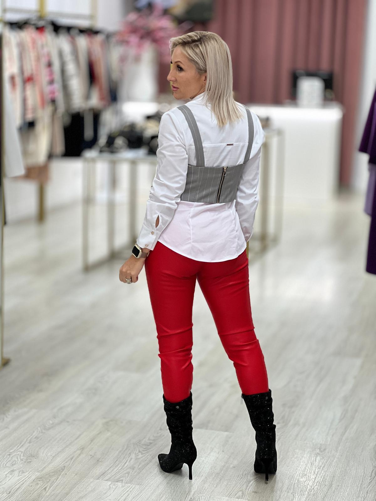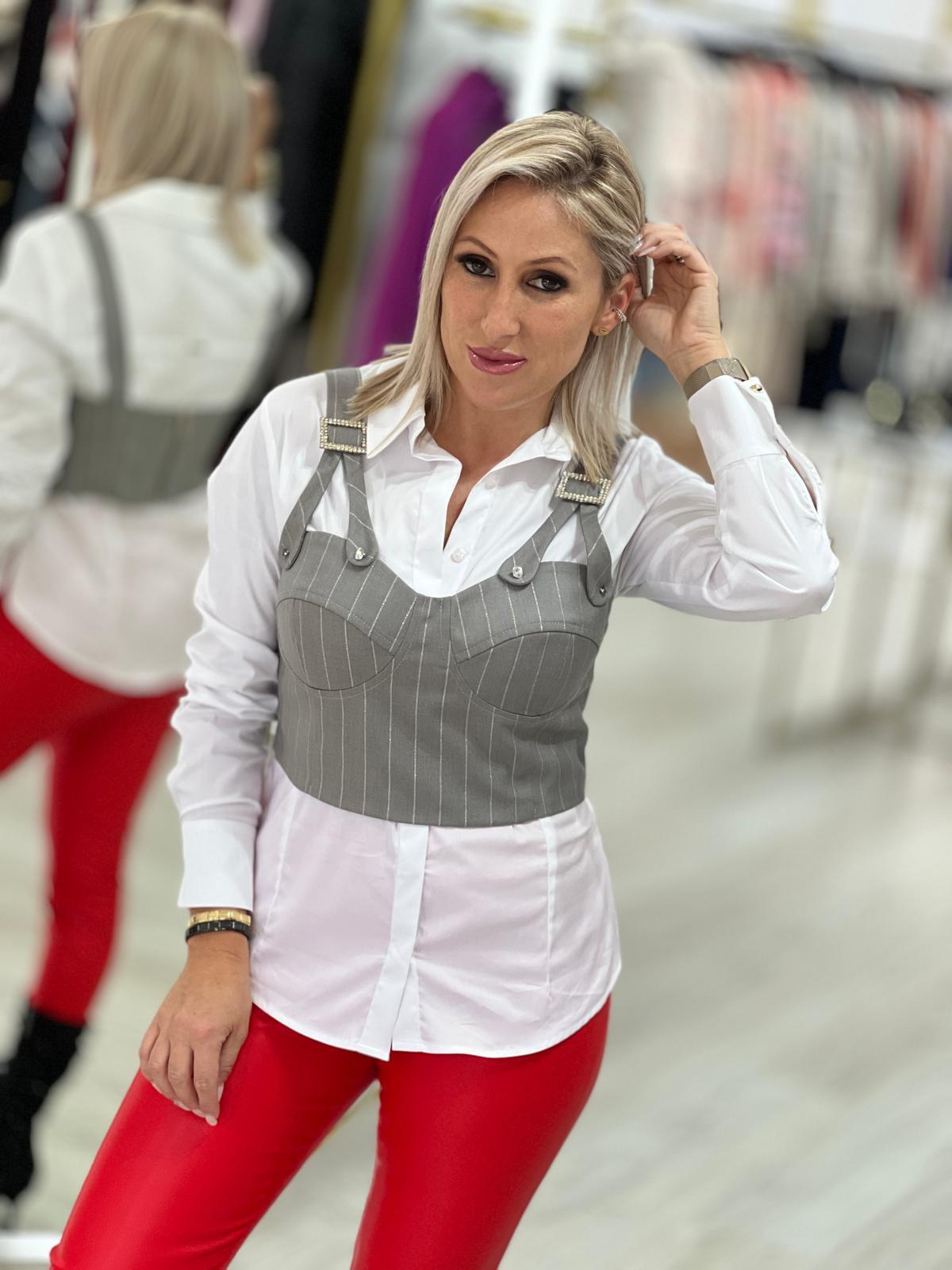 Crop top com peito estruturado com copas.. Alça larga no mesmo tecido, não ajustável. Pormenor de botão e fivela metalizada com strass. Fecho atrás com fecho de correr metálico. Forro combinado a contrastar.