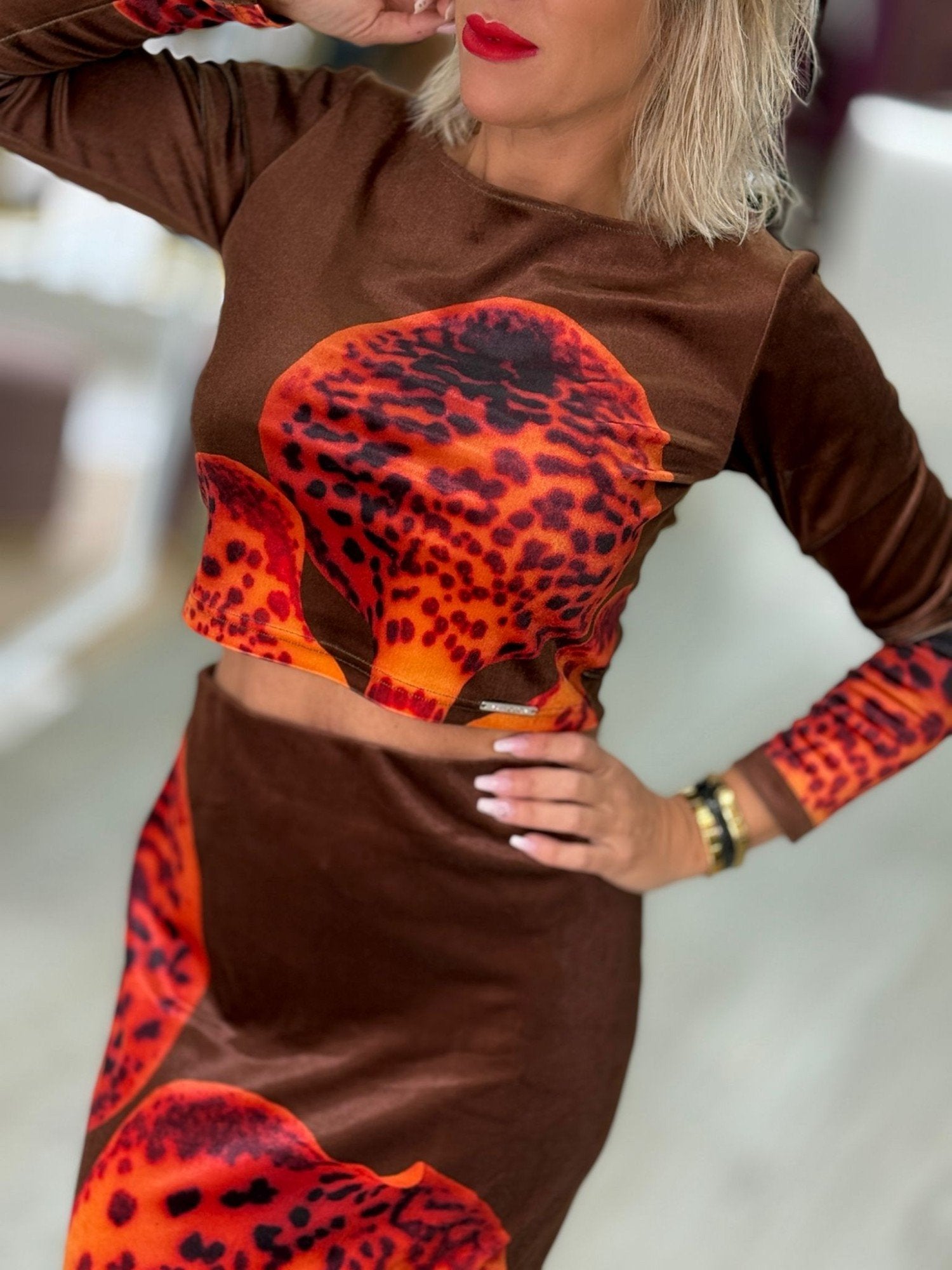 Top em veludo de textura suave, com estampa de orquídea em contraste intenso. O design justo e de linhas puras equilibra sensualidade e modernidade, criando uma peça de impacto visual e refinamento subtil.