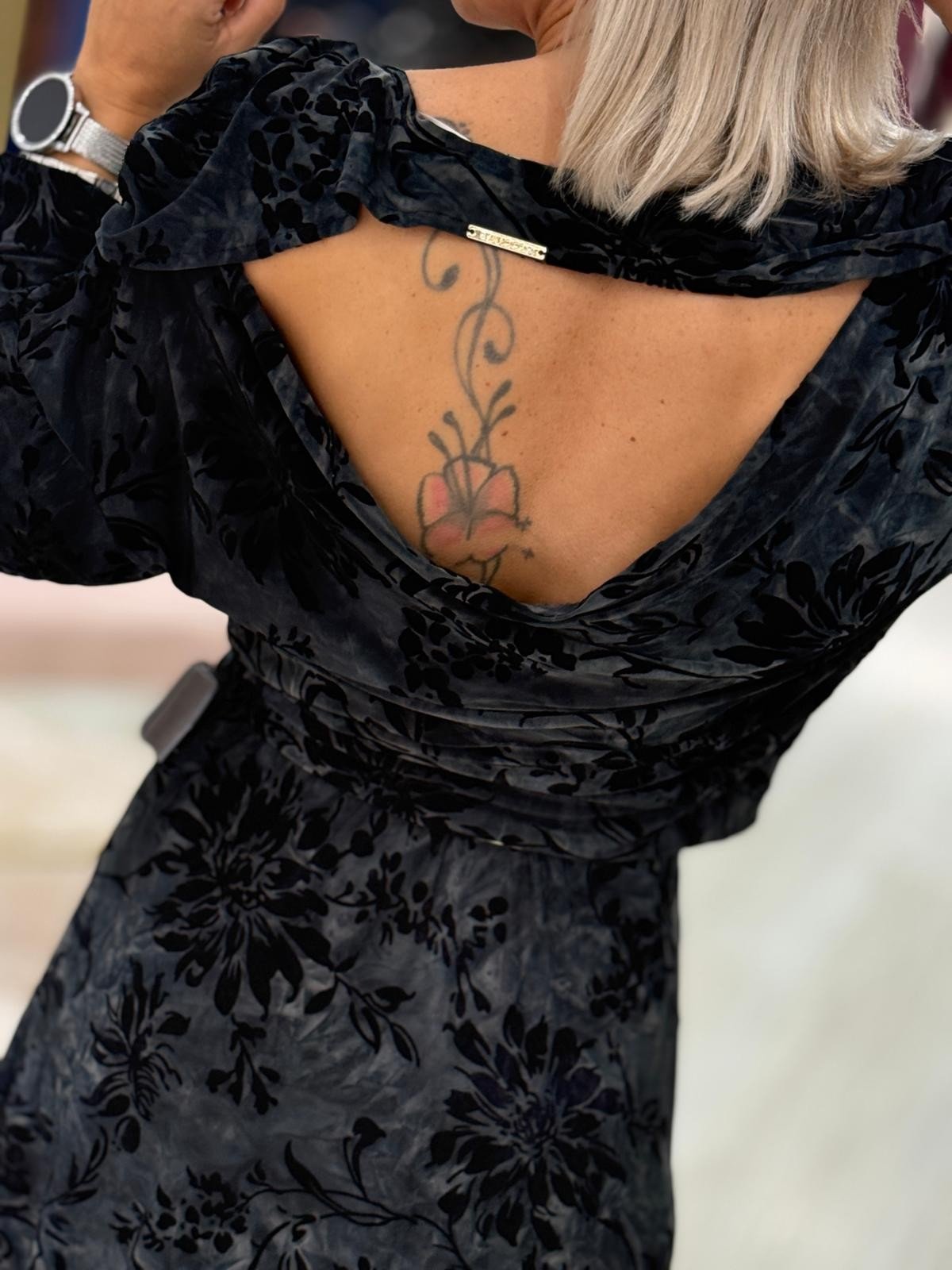 Top em veludo devoré com padrão floral em relevo. Apresenta decote ombro a ombro e mangas compridas. O design inclui uma abertura nas costas que revela a silhueta de forma subtil. Confeccionado em tecido de textura rica e toque suave, combina estrutura e fluidez num equilíbrio contemporâneo.