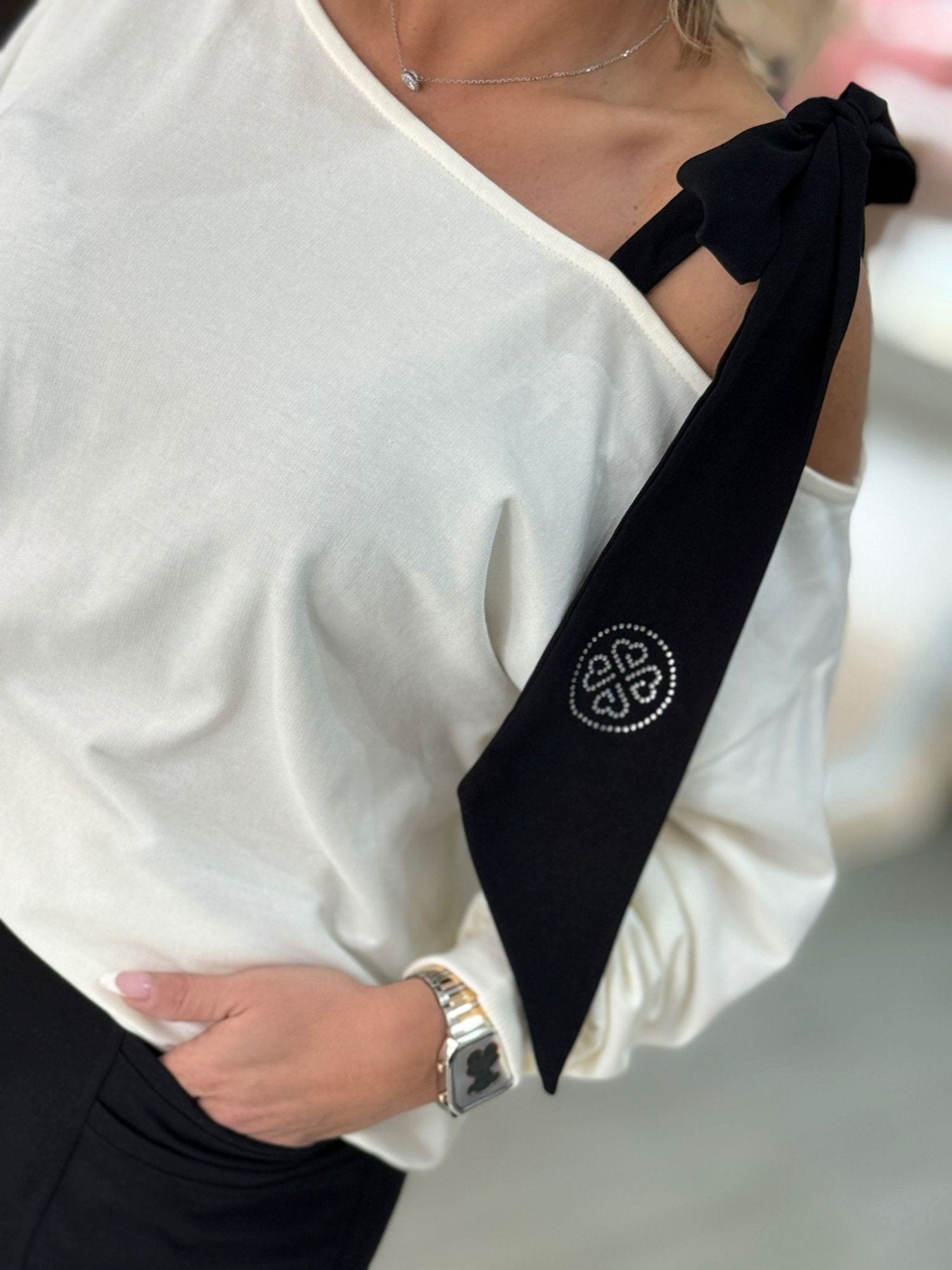 Training com sweat de decote à barco com laçada. Calças com bolsos laterais e elástico na cintura.