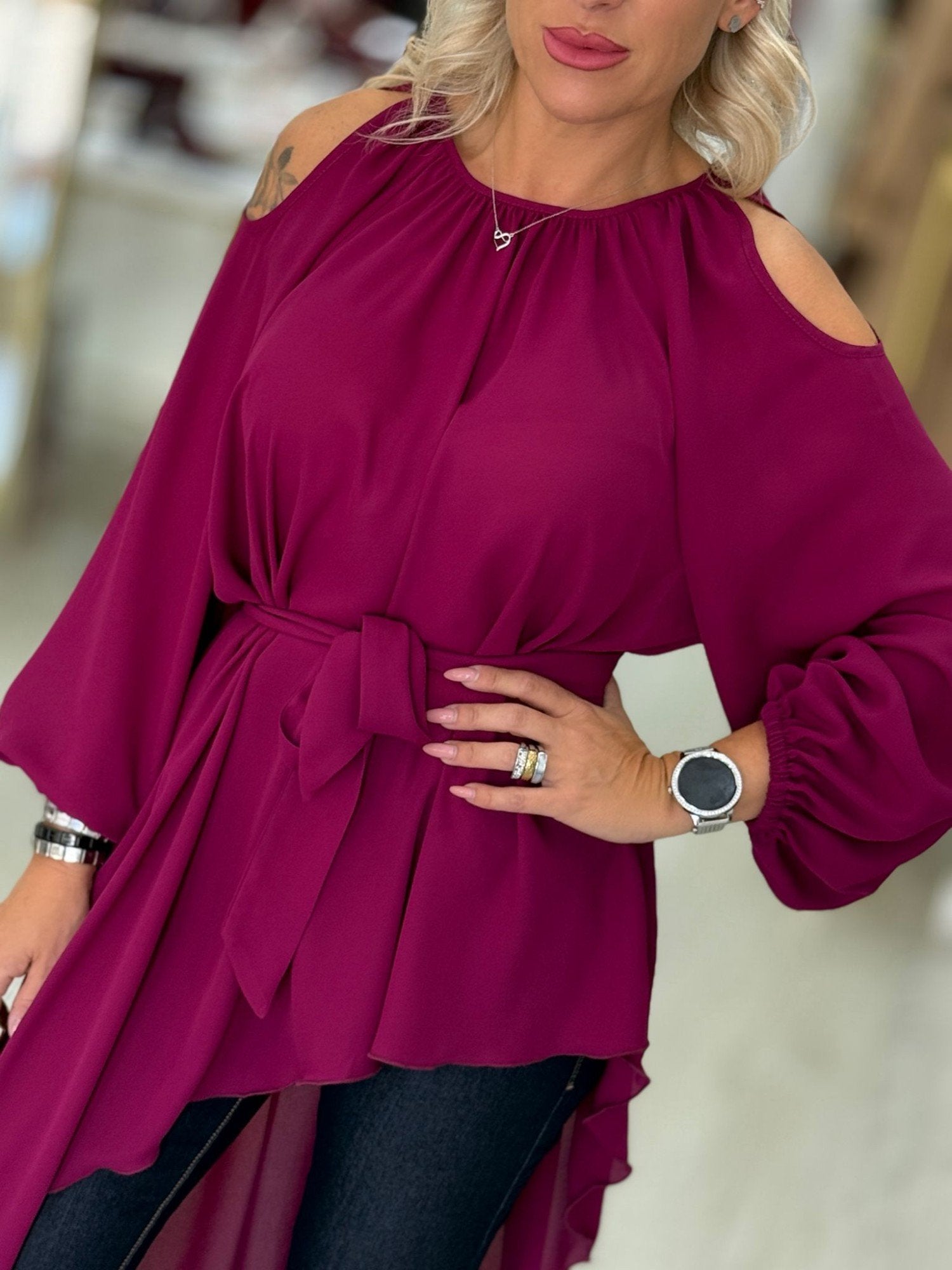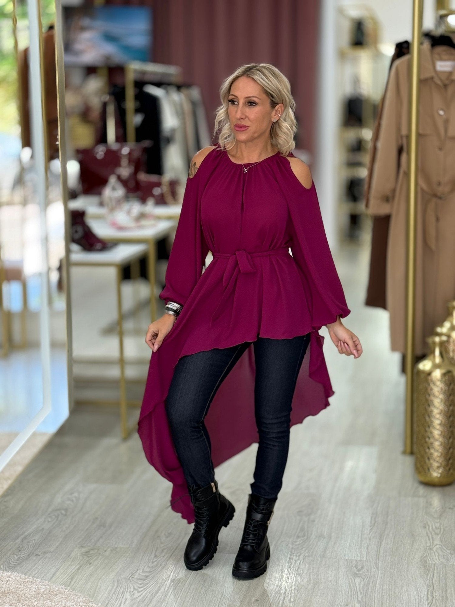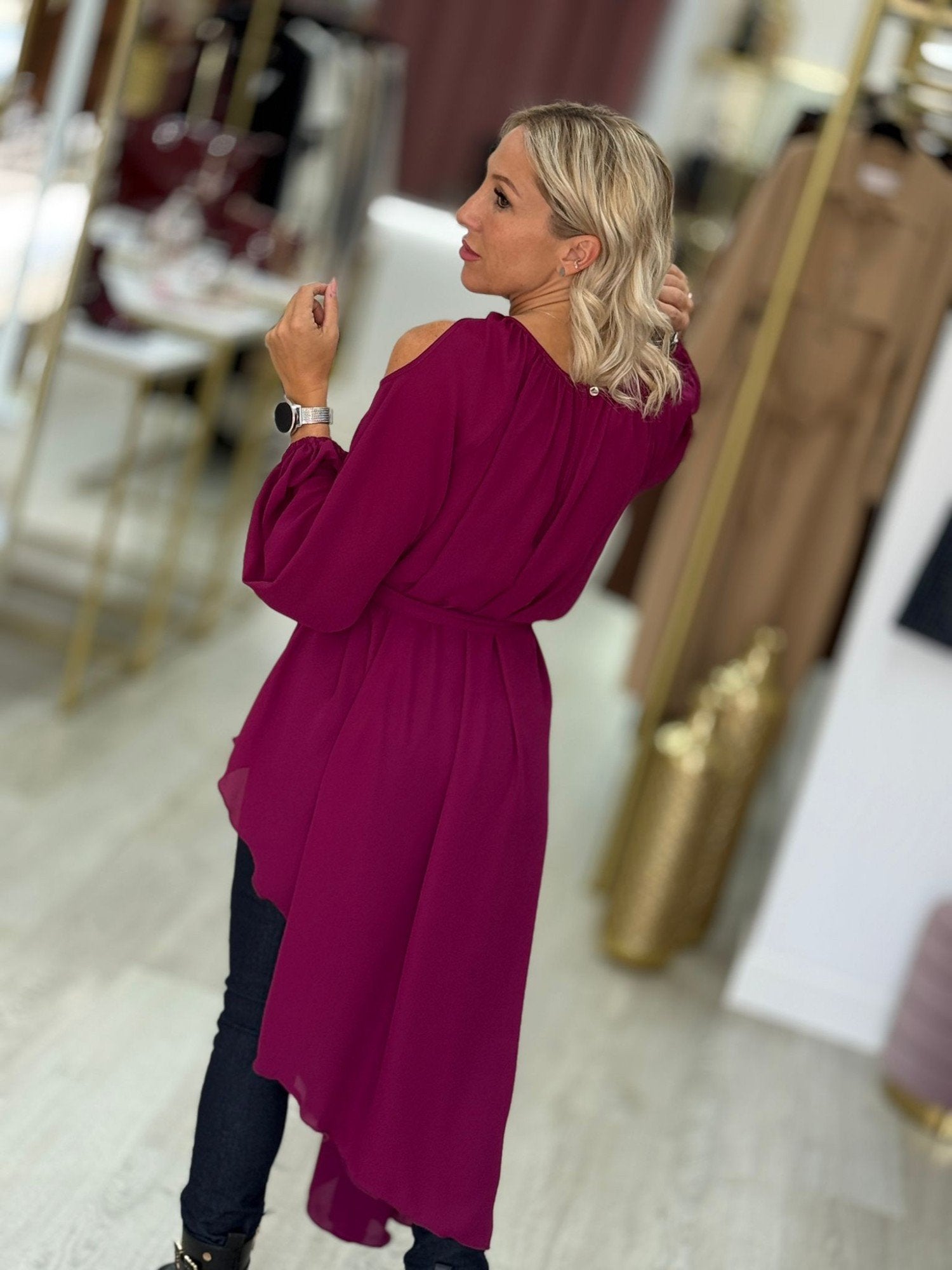 Túnica assimétrica, num tecido muito leve e fluído. Modelo oversize. Decote redondo. Mangas compridas com terminação com elástico, abertura nos ombros. Fecha atrás no pescoço um um pequeno botão dourado.