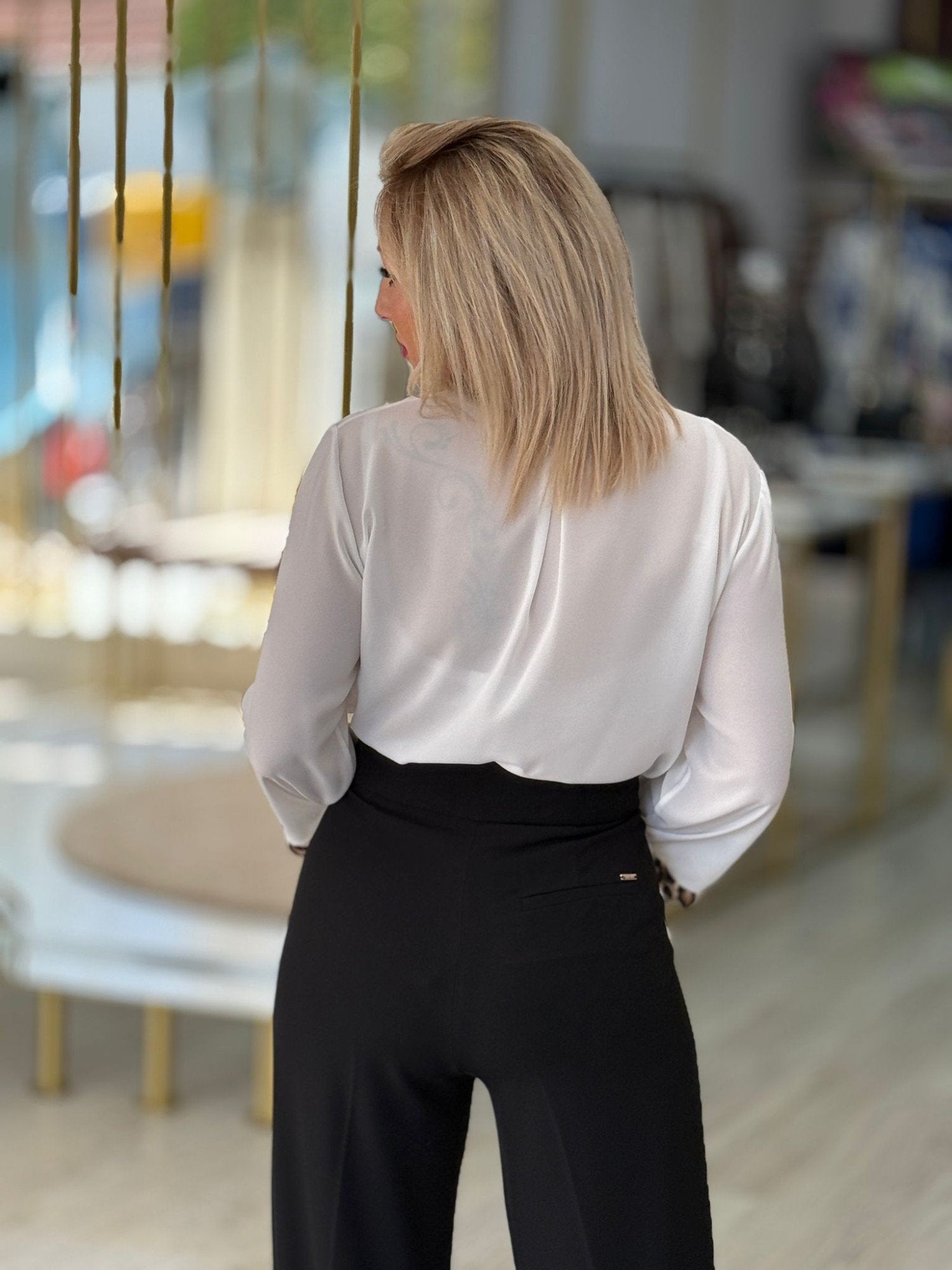 Dê um toque arrojado e sofisticado ao seu look com a túnica Silvina Campos num delicado tom pérola com detalhes contrastantes. Confeccionada em 100% poliéster, tem um corte fluido e confortável que se adapta com leveza ao corpo. O destaque vai para o decote em V, realçado por um folho em em padrão animal que acrescenta um contraste ousado e cheio de personalidade. As mangas 3/4, também com detalhe contrastante no punho, tornam esta túnica perfeita para usar em qualquer estação, seja num coordenado mais casual ou num look mais elegante. Uma peça statement para quem gosta de moda com atitude.