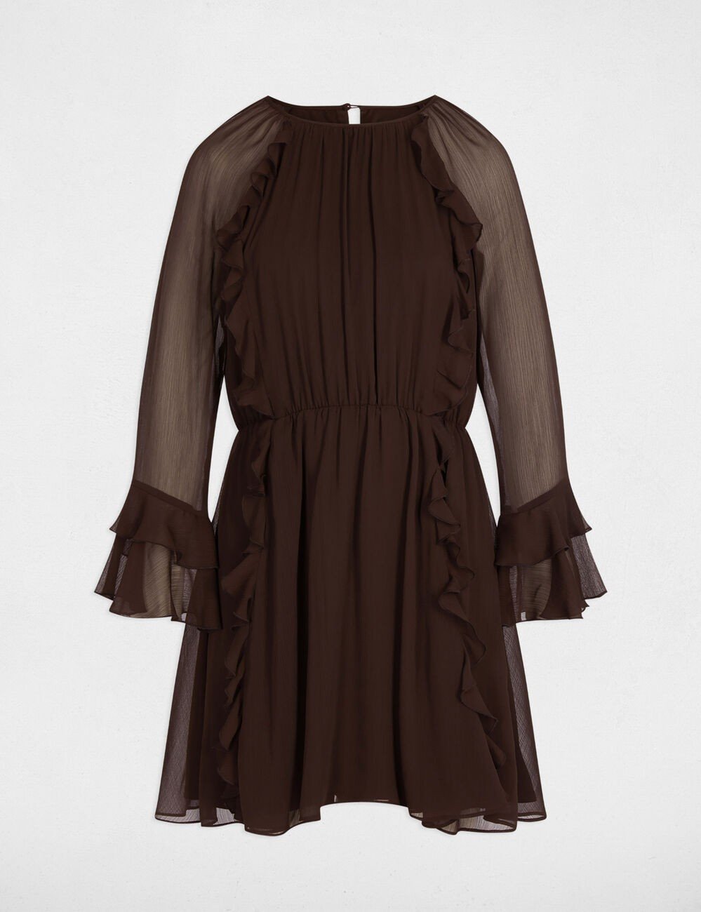 Vestido fluído curto em animal print. Decote redondo. Mangas compridas com terminação em folho. Folhos na frente. Elástico na cintura. Fecha nas costas com botão. Forrado.
