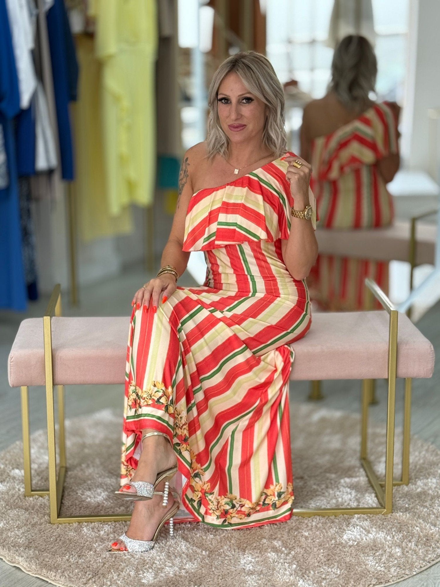Vestido comprido em malha fria. Decote assimétrico com um ombro, com folho.