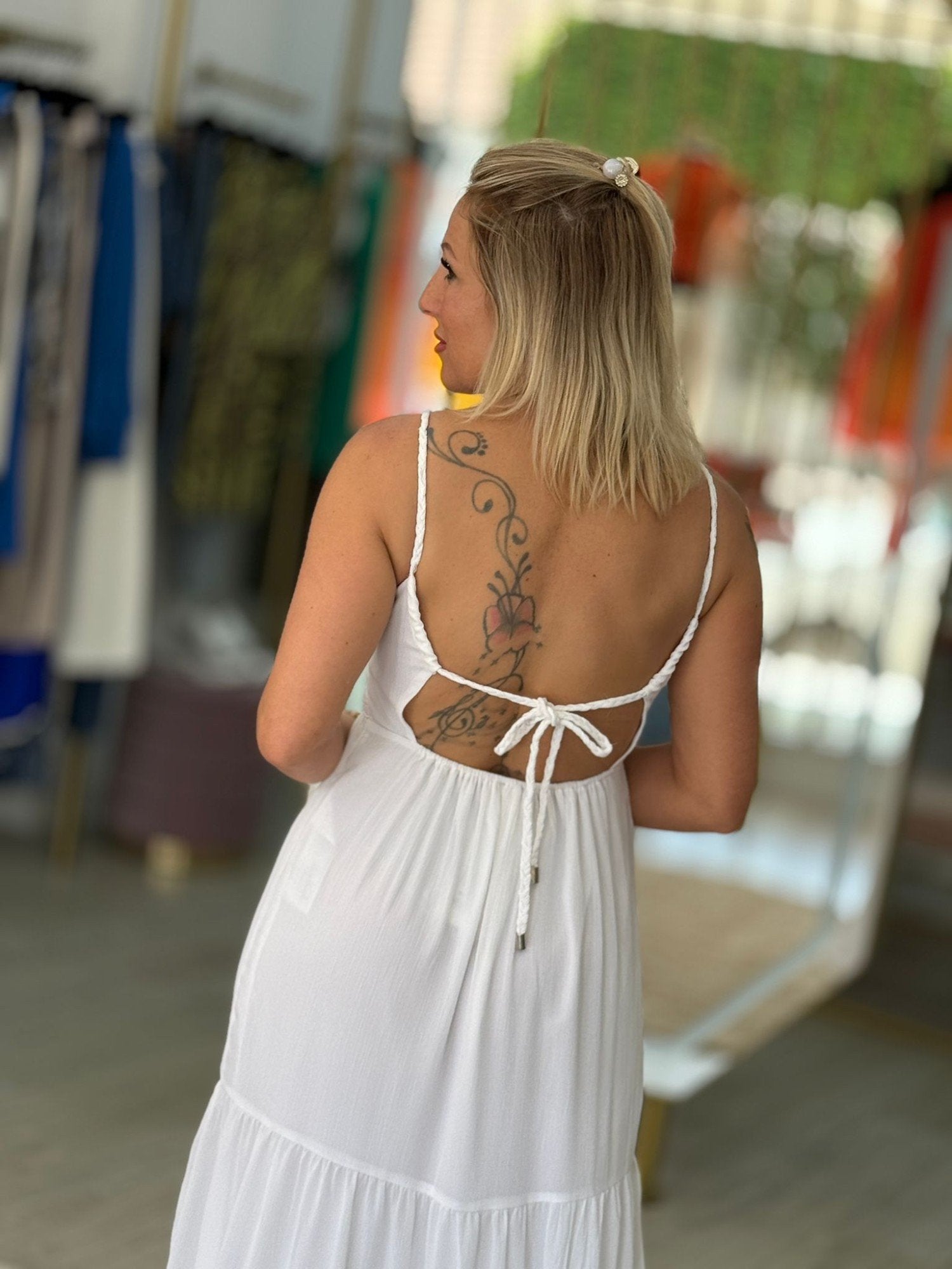 Vestido comprido de alças finas entrançadas. Decote em V. Aberto nas costas com laçada ajustável. Bainha com bordado. Elástico nas costas. Forrado.
