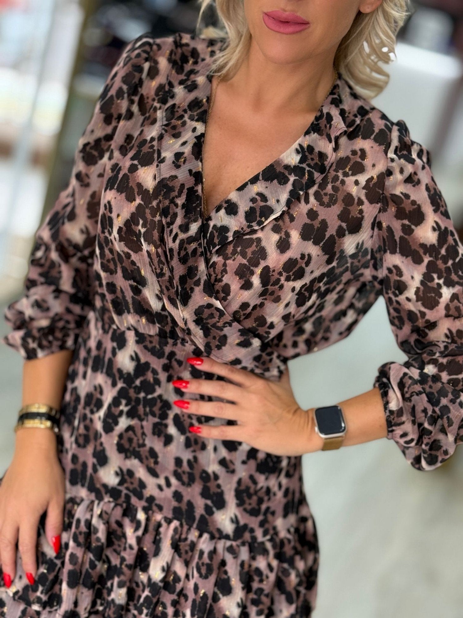 Vestido curto com estampa animal, decote em V e manga comprida. Elástico na cintura atrás. Fecha com fecho na parte de trás.